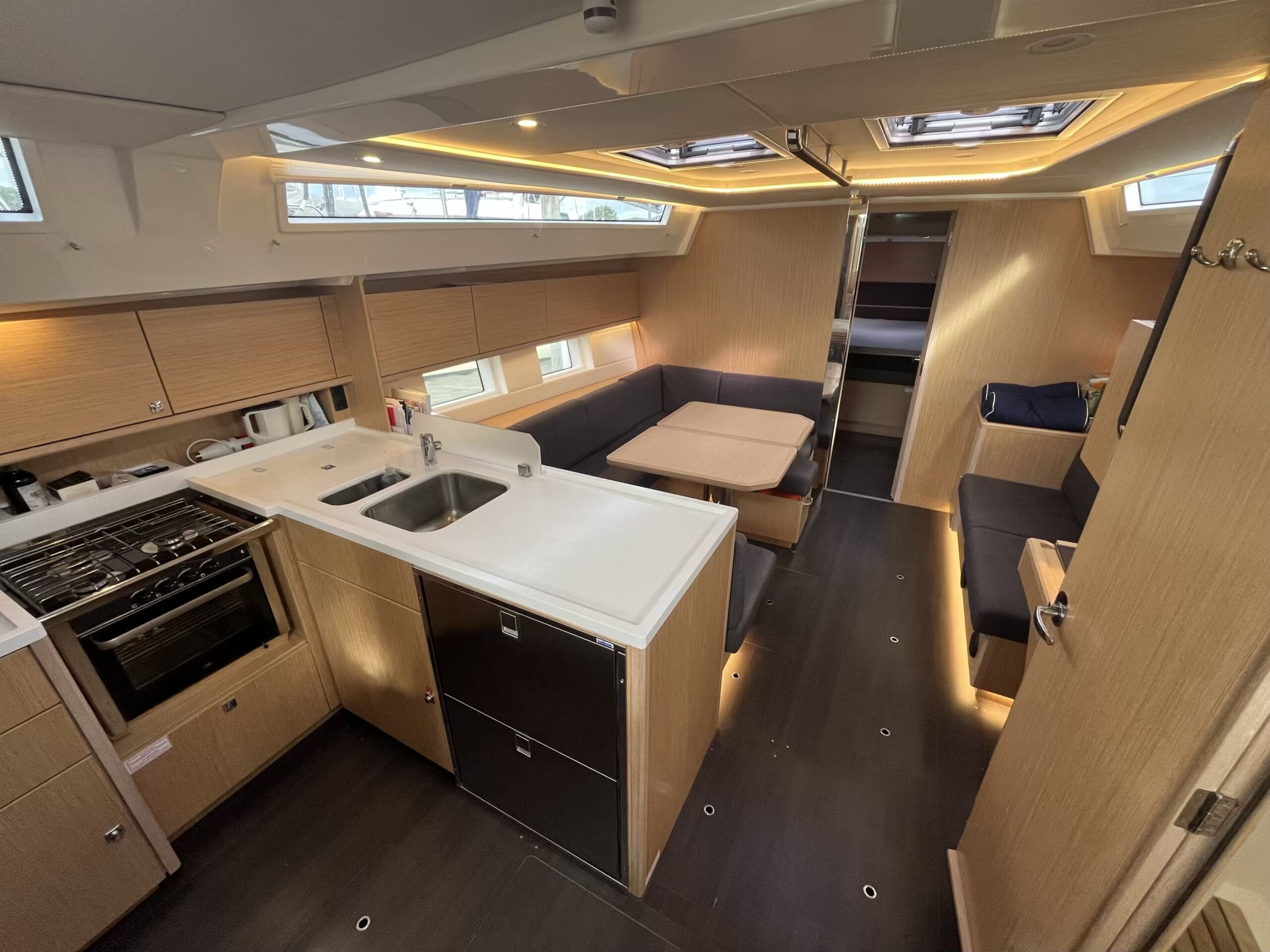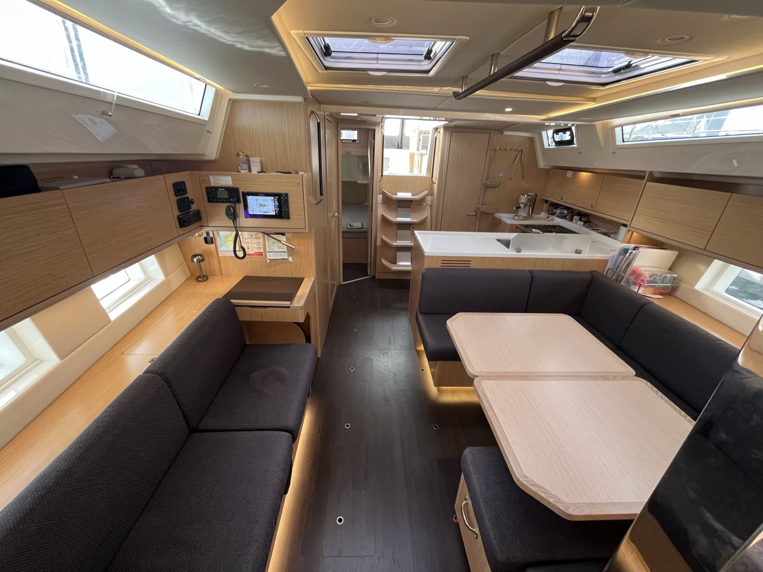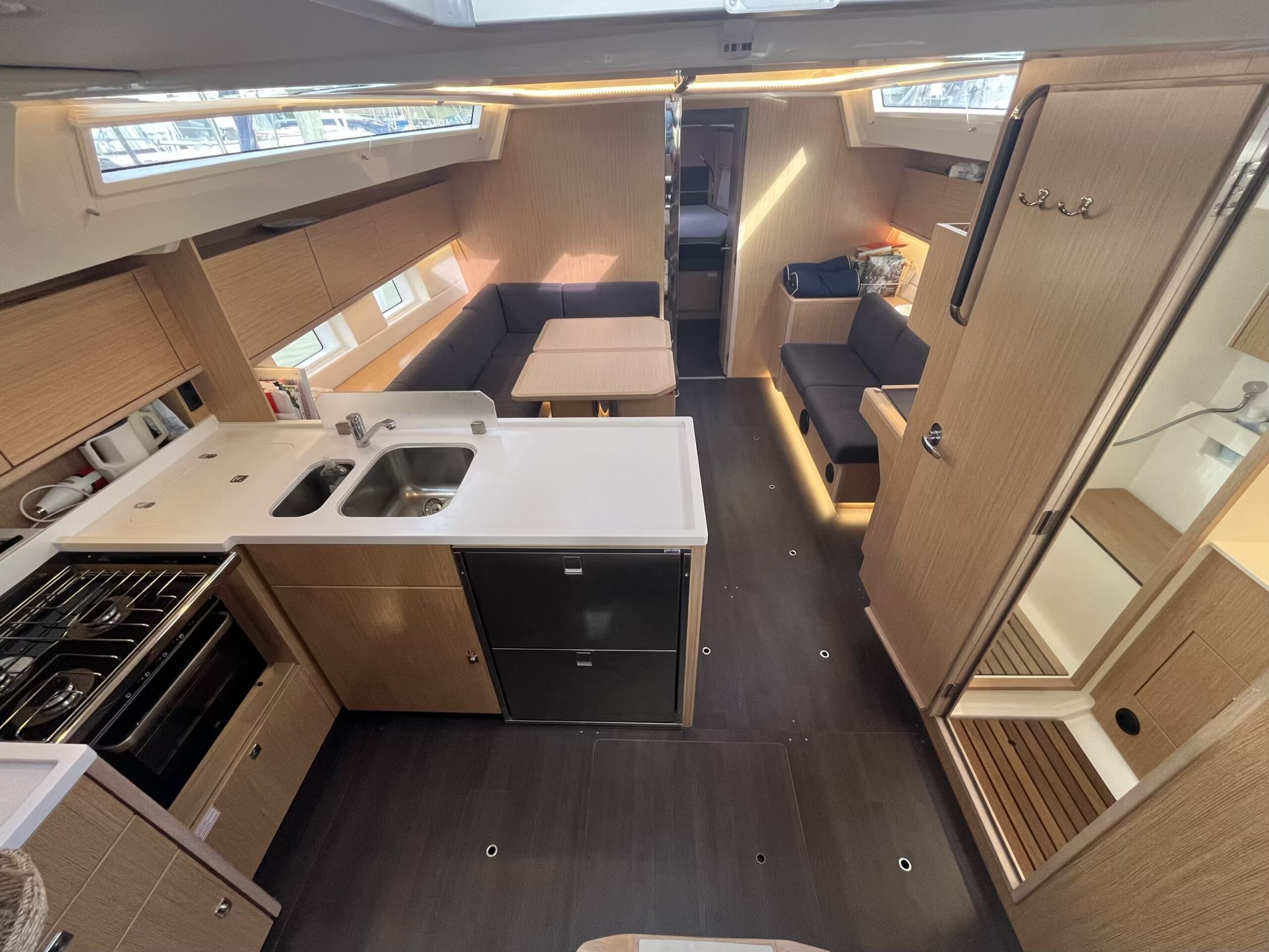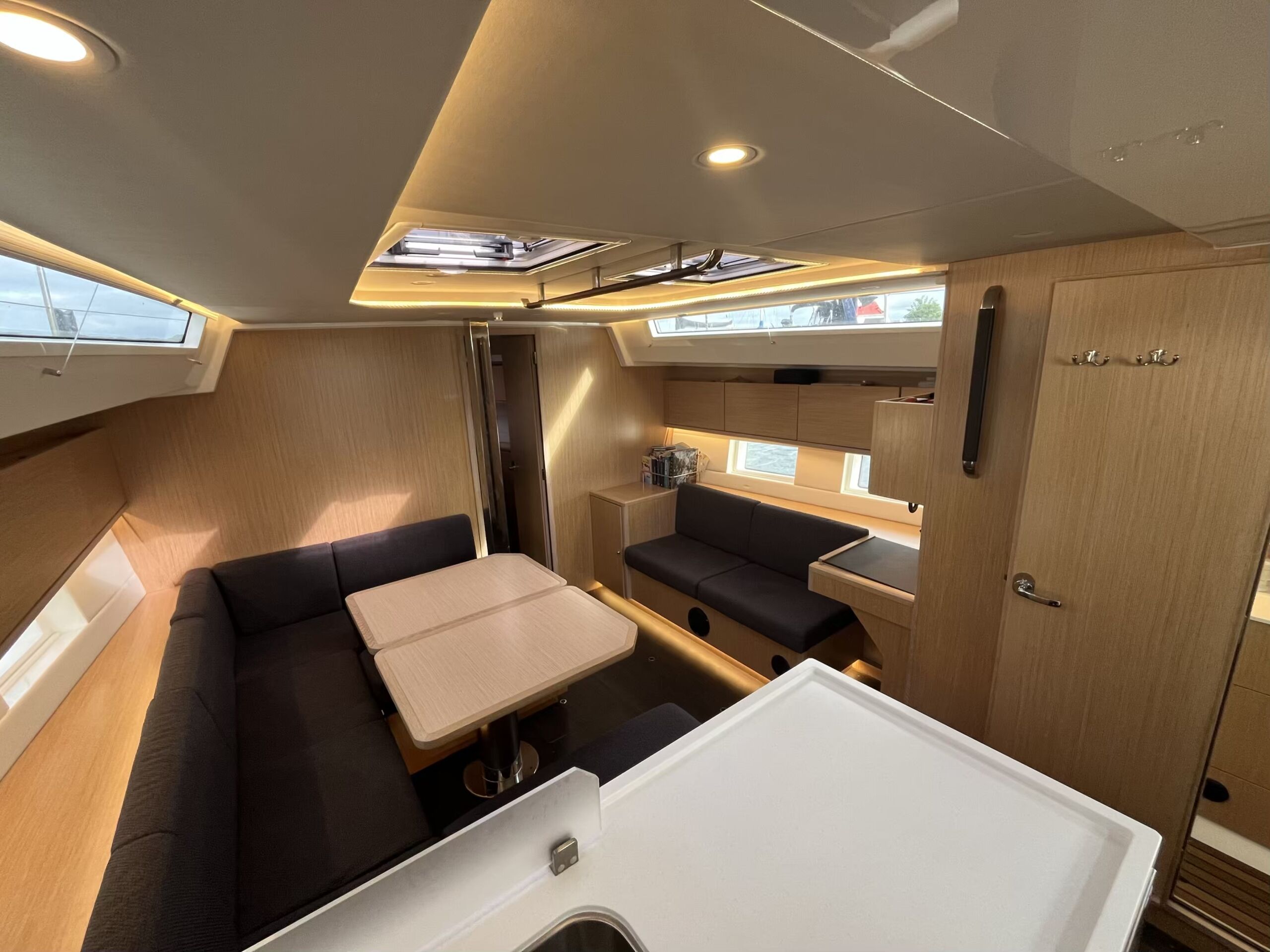 Stor og lys salon med masser af opbevaringsplads, pantry i bagbord side, corian bordplade med praktisk kant, lysdæmpere i kahytter og salon, elektrisk hæve/sænke TV