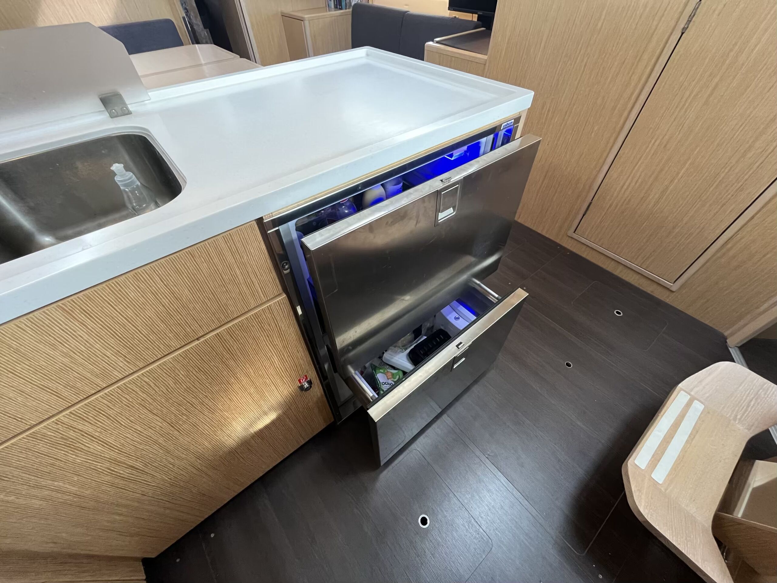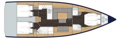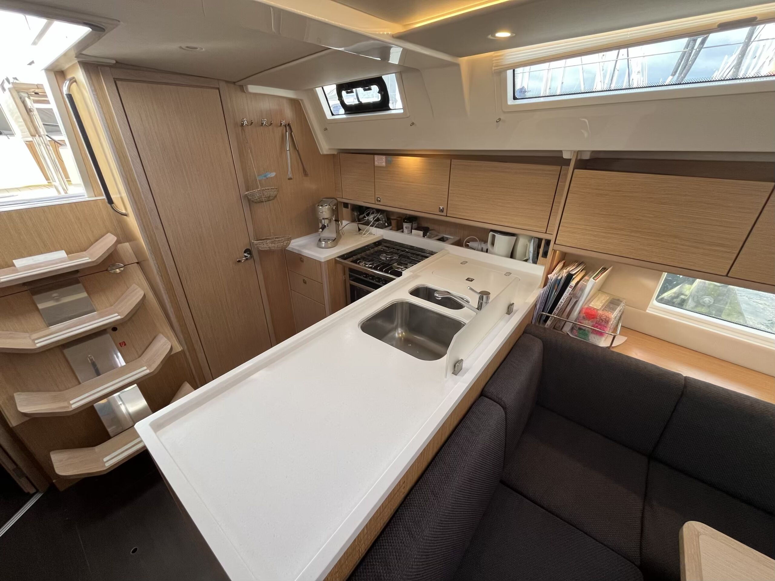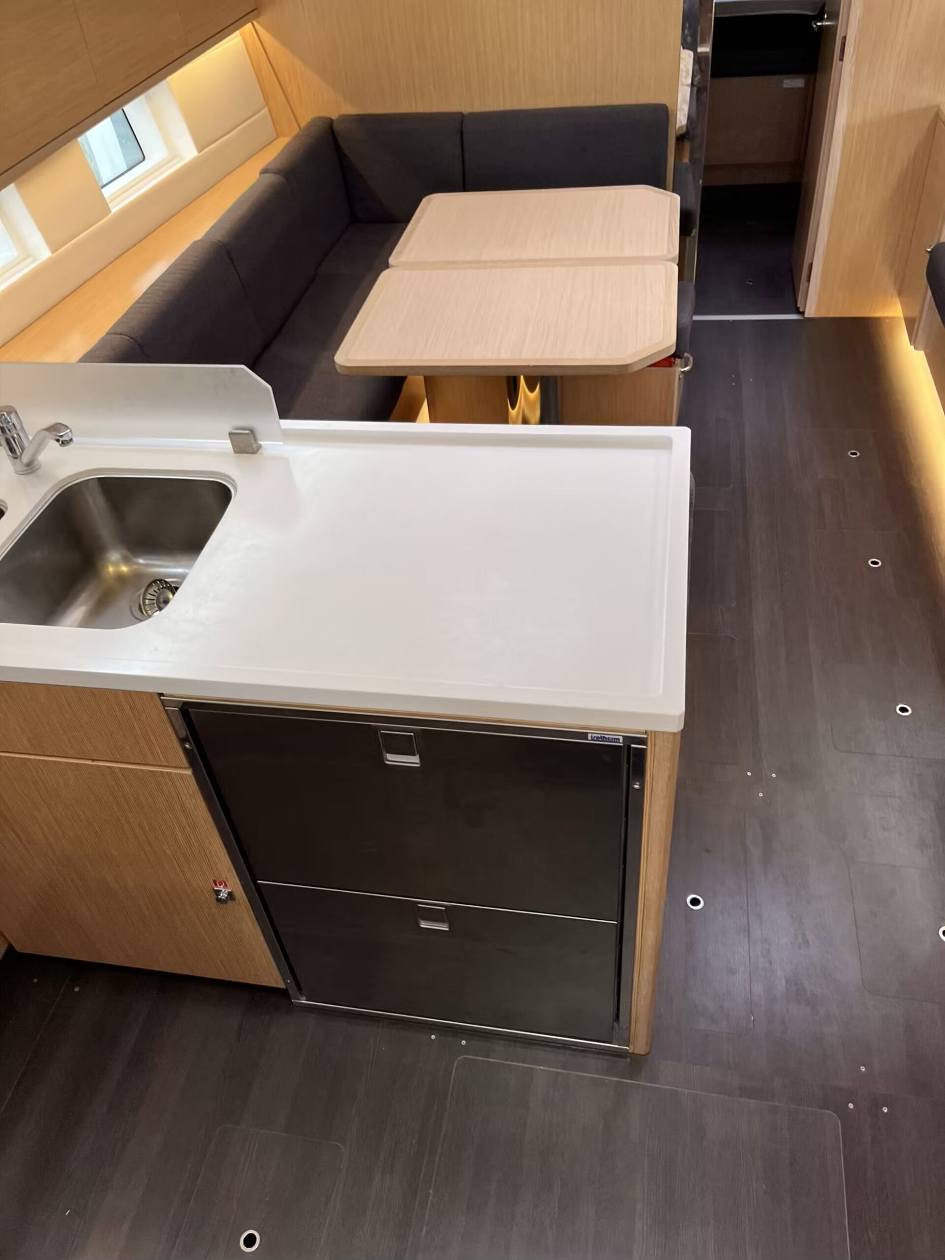 Stor og lys salon med masser af opbevaringsplads, pantry i bagbord side, corian bordplade med praktisk kant, lysdæmpere i kahytter og salon, elektrisk hæve/sænke TV