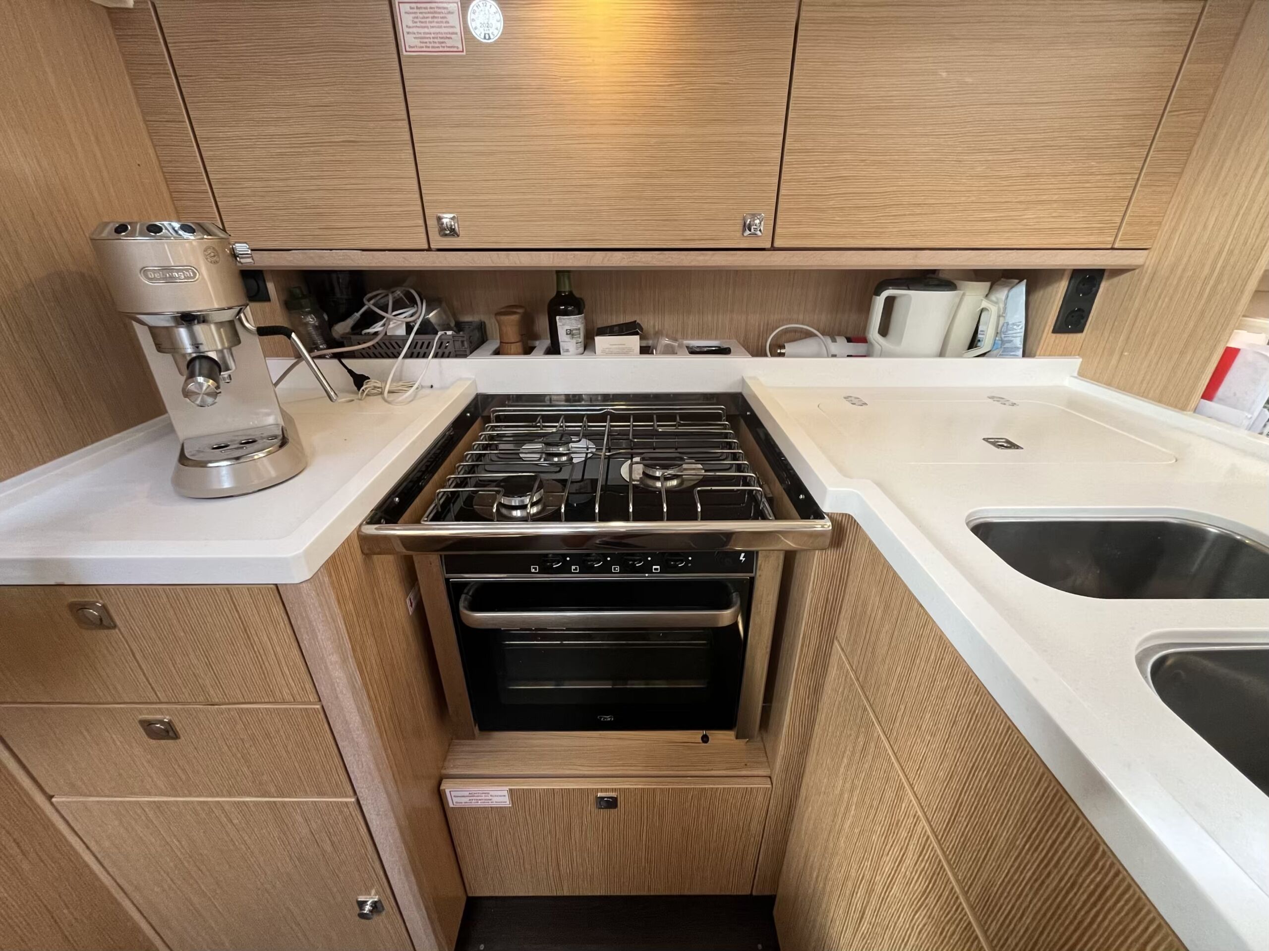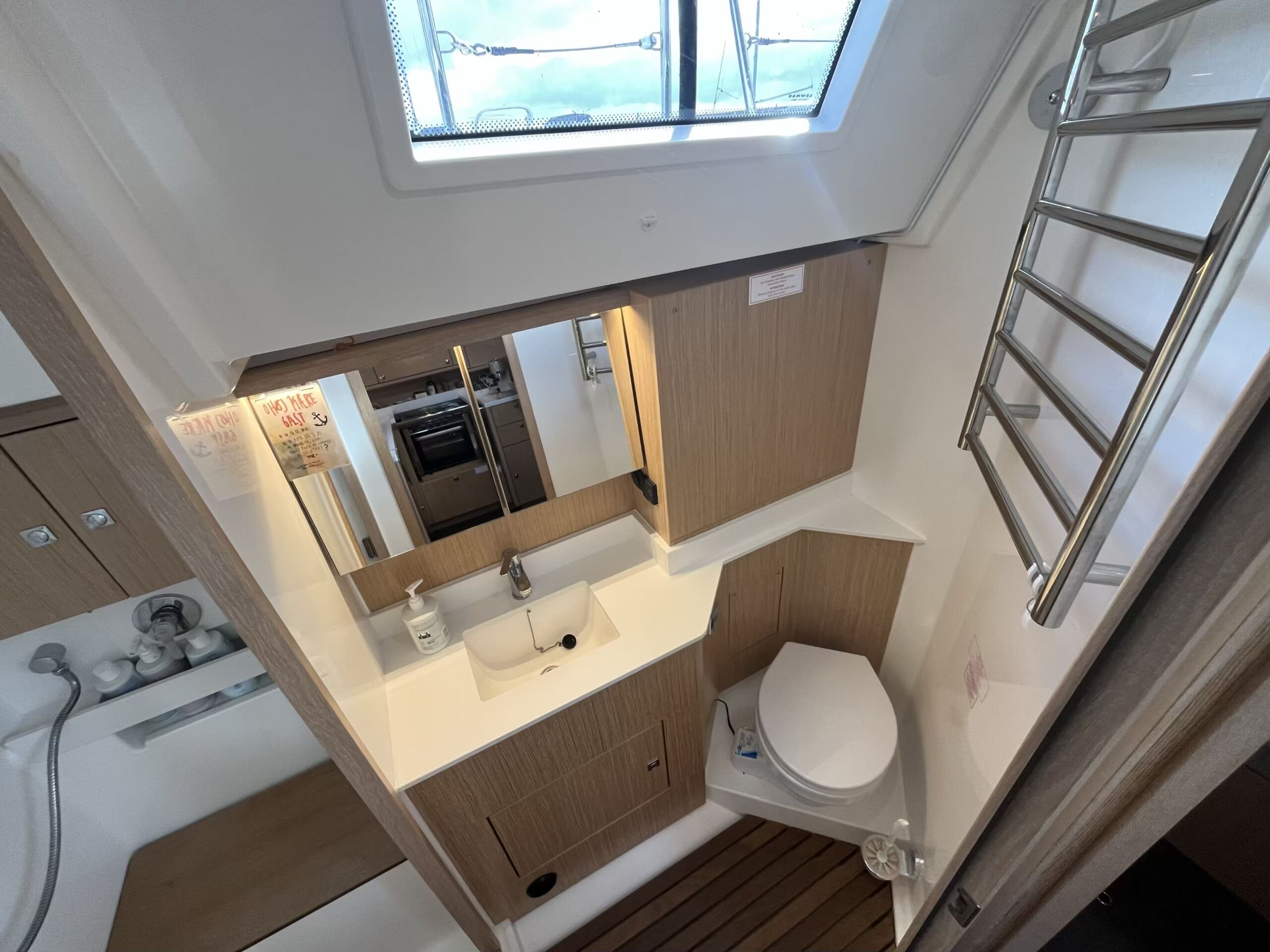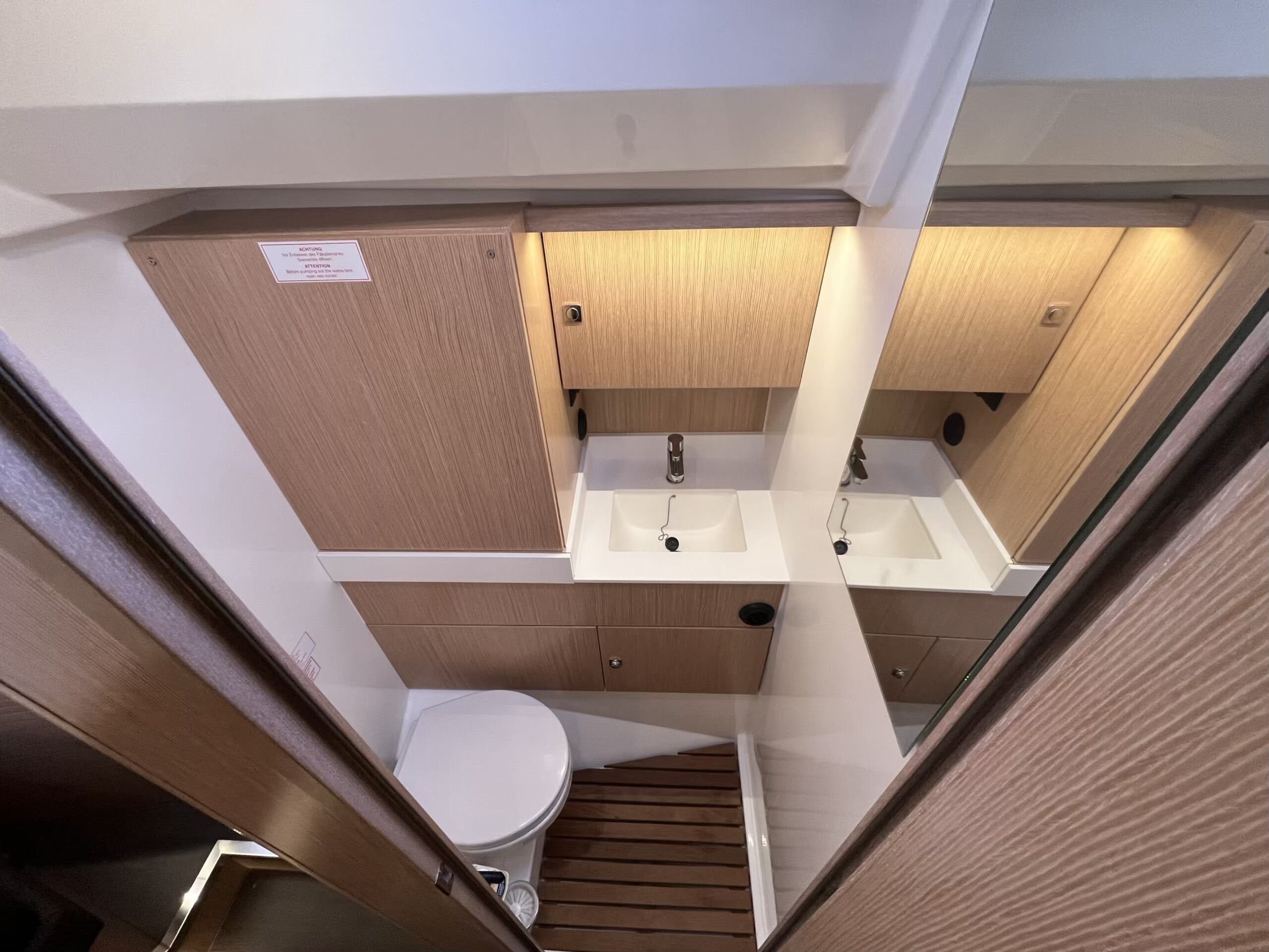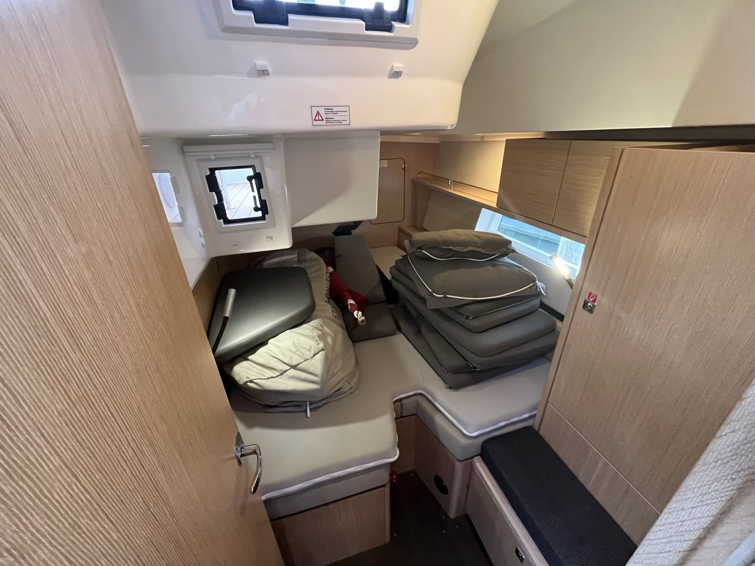 Stor og lys salon med masser af opbevaringsplads, pantry i bagbord side, corian bordplade med praktisk kant, lysdæmpere i kahytter og salon, elektrisk hæve/sænke TV