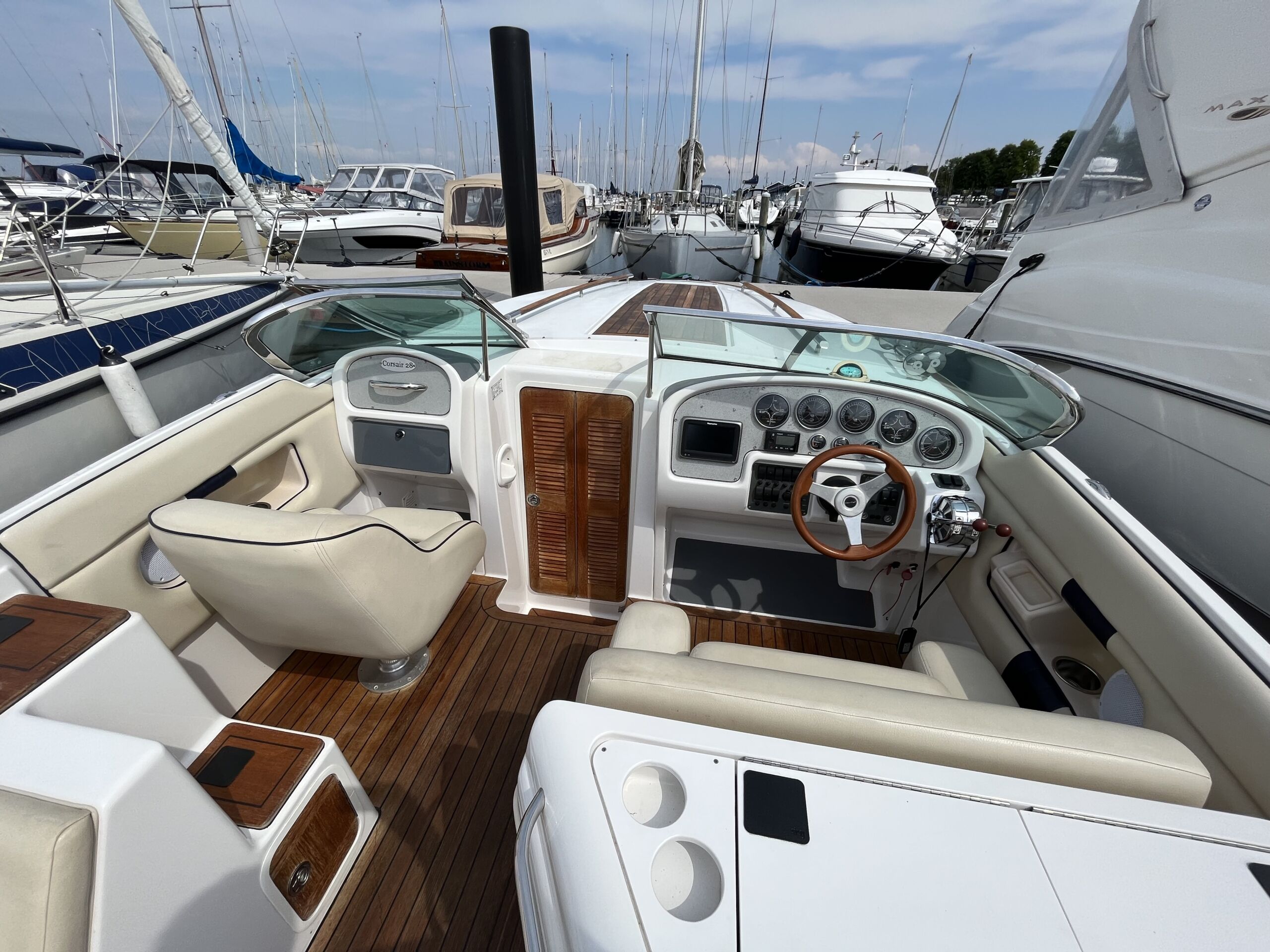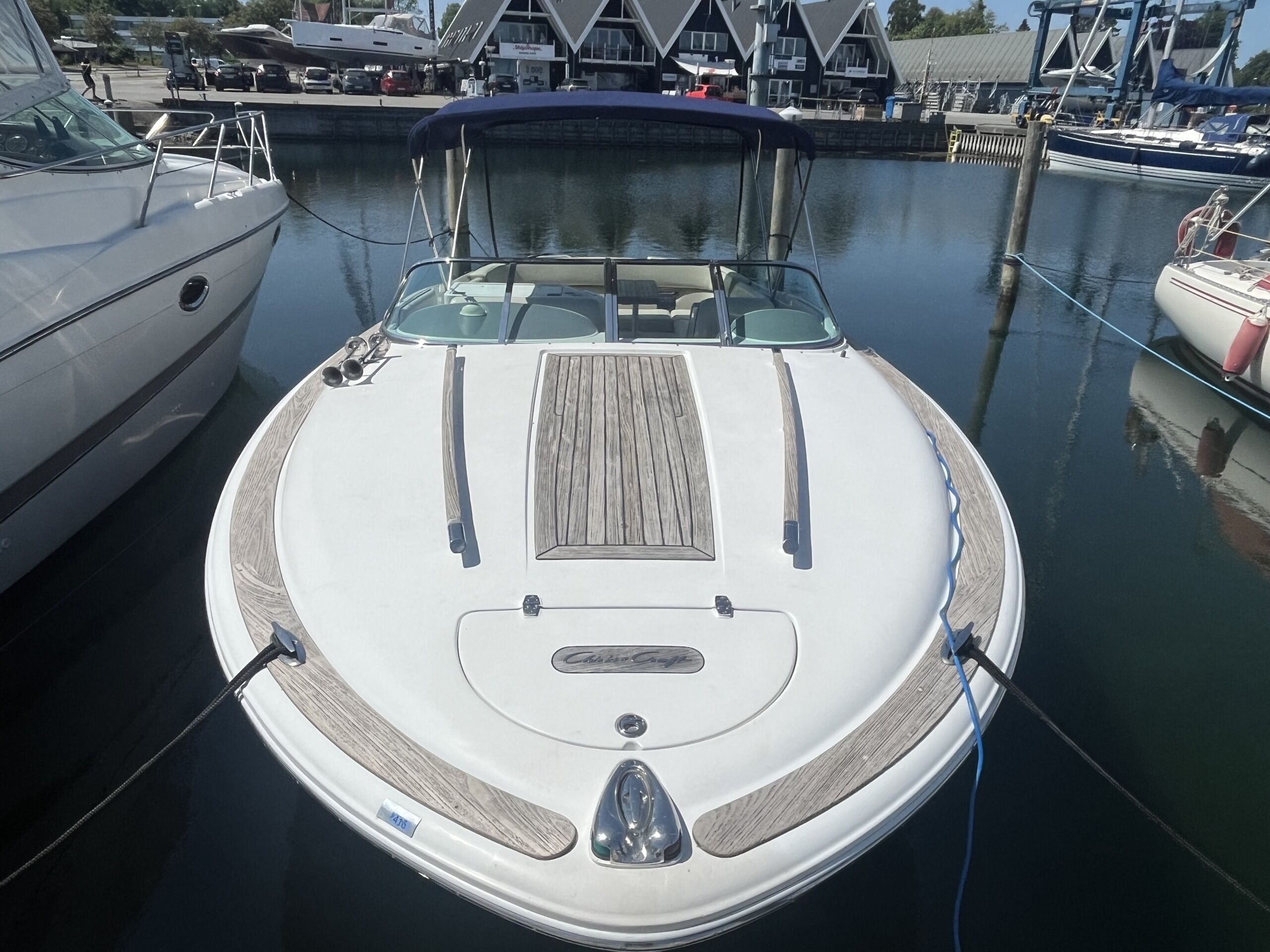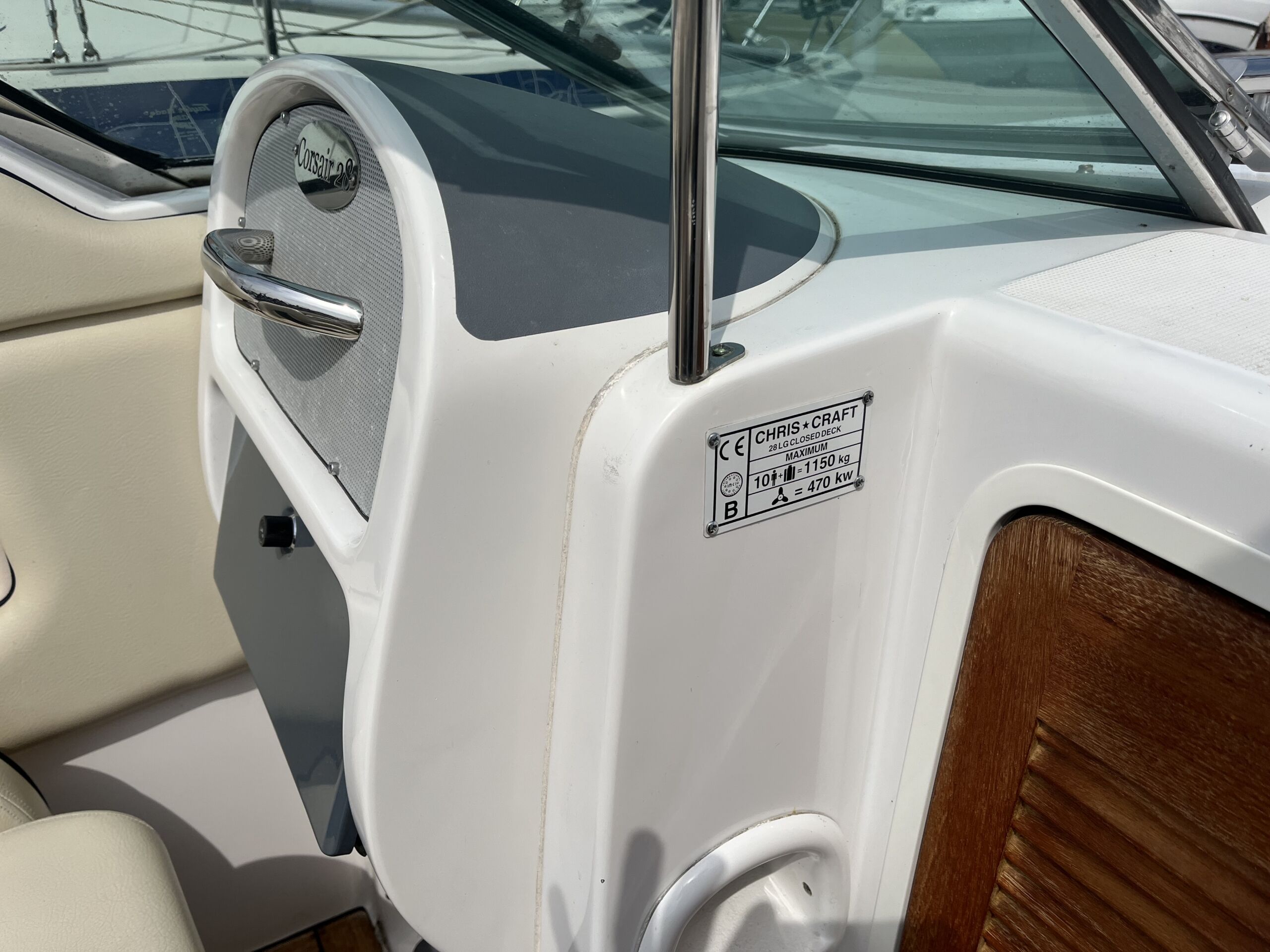 Chris Craft 28 Corsair fra 2004 i den smukke Heritage version. Båden er i den klassiske Midnight Blue farve og har 2 x Volvo Penta med duoprop og bovpropel med remote control for nem og enkel manøvrering. Chris Craft Corsair 28 er en stor, komfortabel og behagelig weekend cruiser, der kombinerer uovertruffen kvalitet med smukt håndværk. Heritage versionen har ekstra teak på fordækket, i cockpittet, kahytsdøren m.v. Båden er kendt for sine fantastiske sejlegenskaber og sine smukke linjer. Det er weekend cruiseren, hvor du kan nyde livet på vandet med venner og familie på 1. klasse med mulighed for en enkelt overnatning.