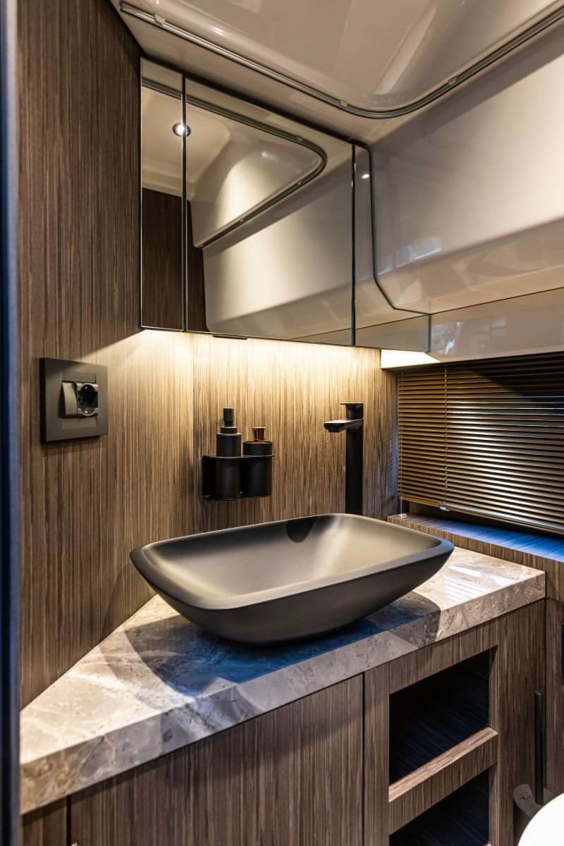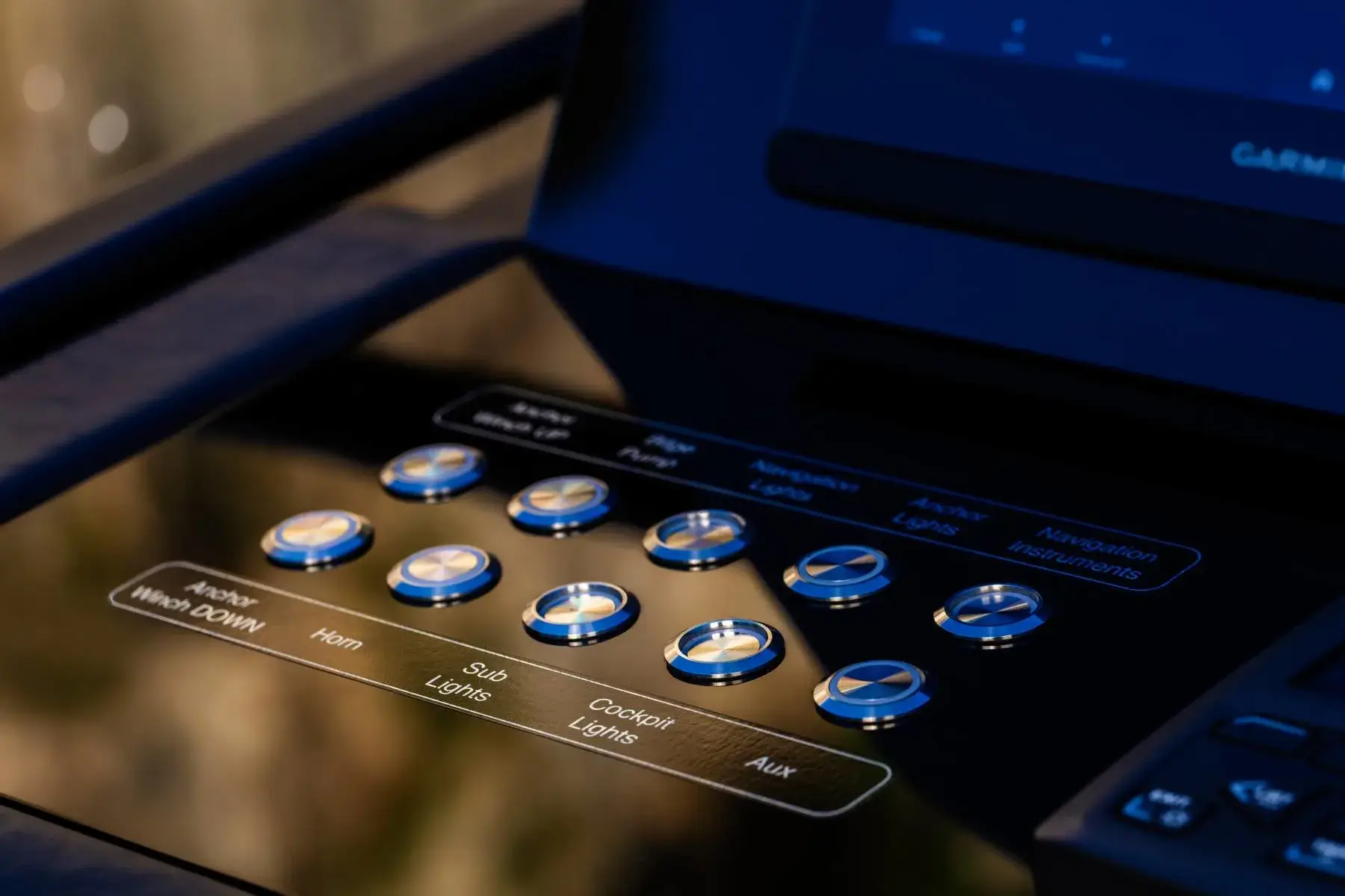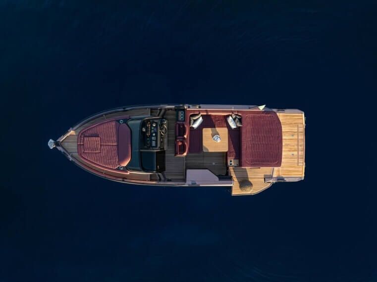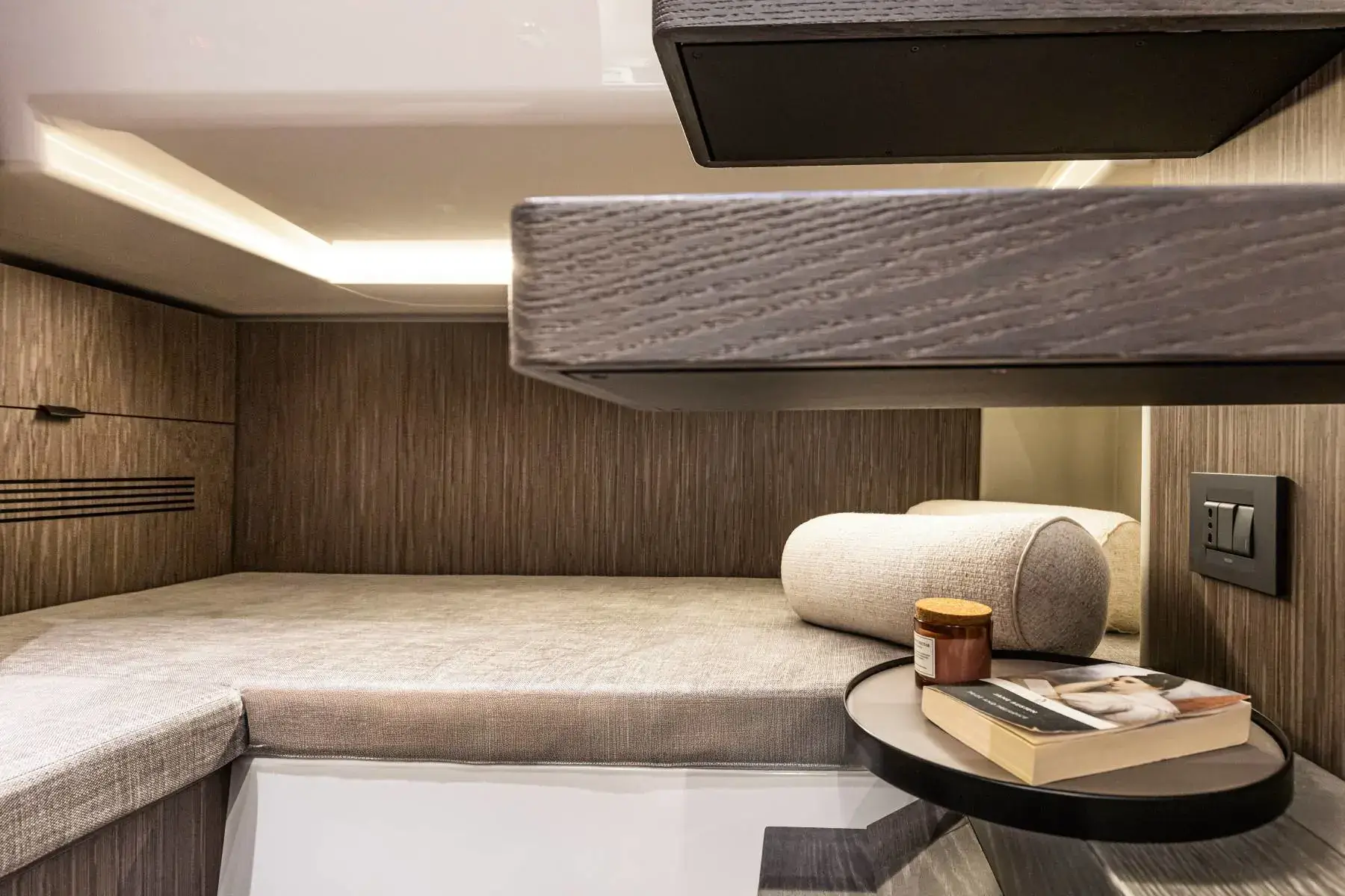 Båden byder på et imponerende cockpitlayout, hvor socialt samvær og funktionalitet går hånd i hånd. Det rummelige solområde agter, den fleksible lounge og det elegante førerområde giver optimale forhold for både afslapning, sejlads og vandsport. Materialerne er nøje udvalgt for deres kvalitet, holdbarhed og æstetik, så du får en luksus oplevelse, der kan mærkes i hver eneste berøring.
