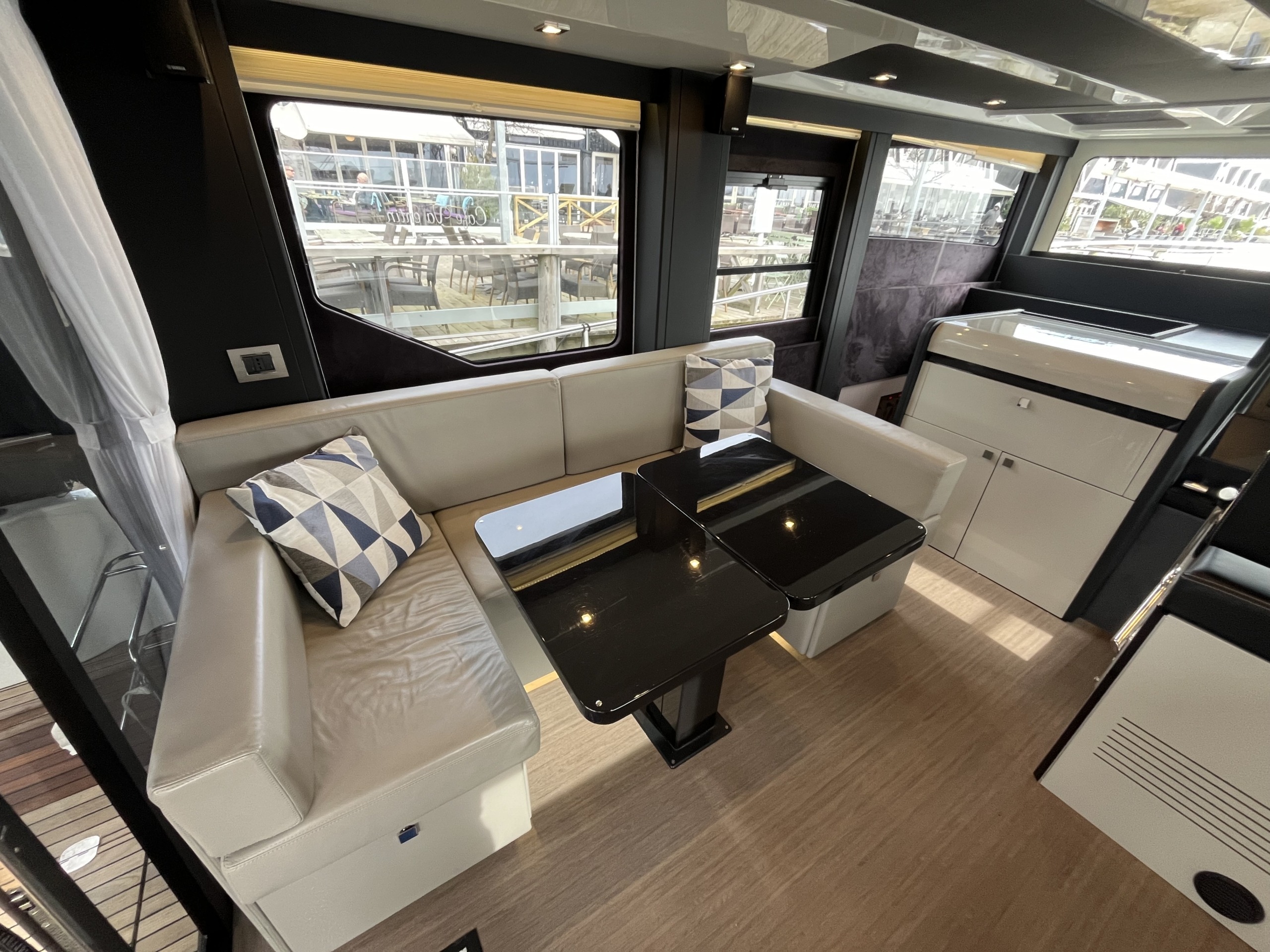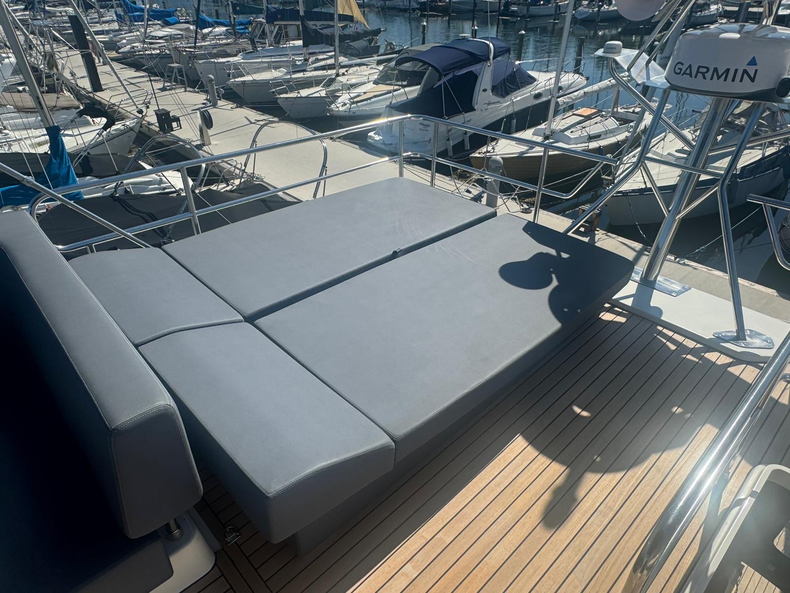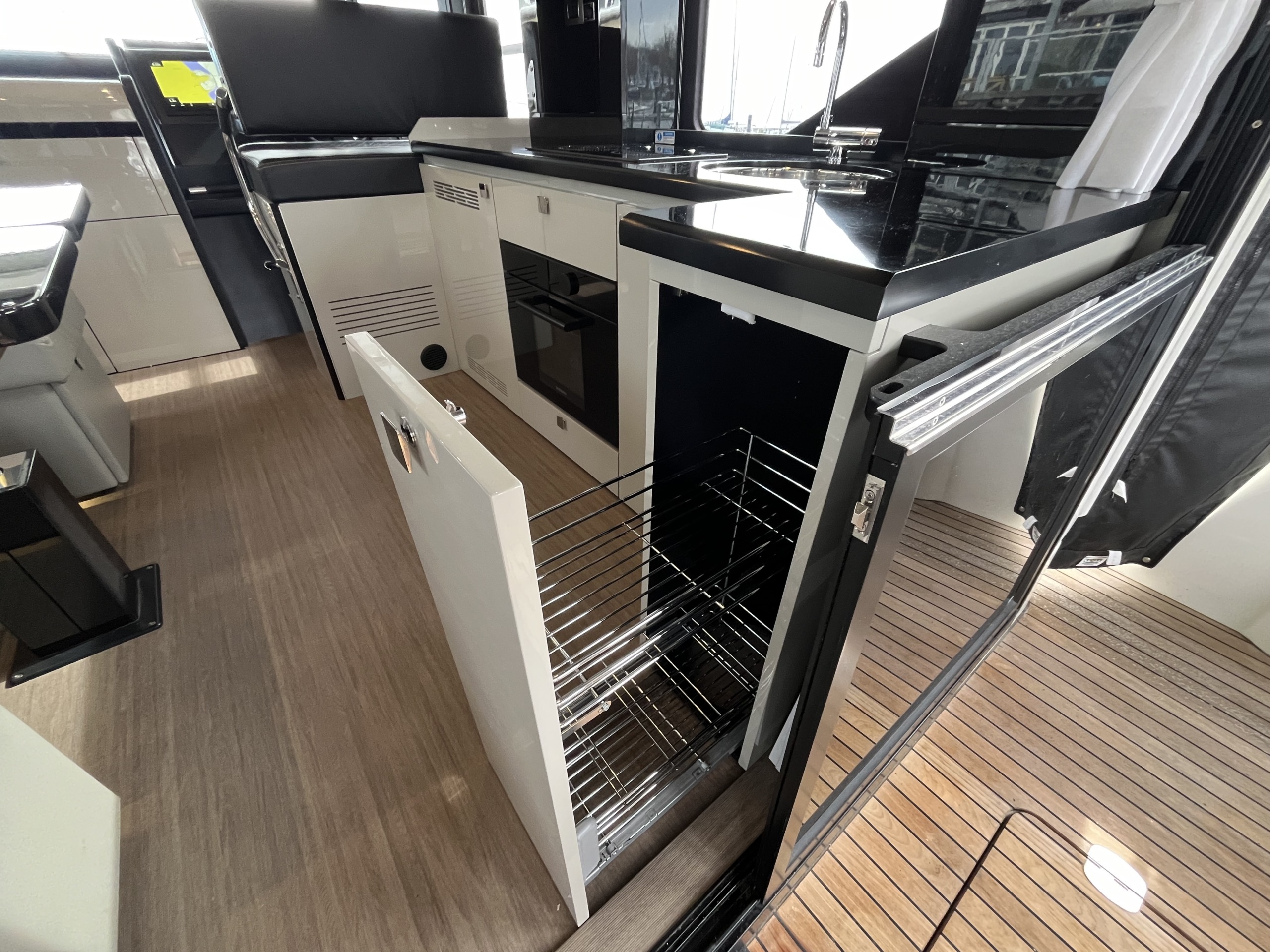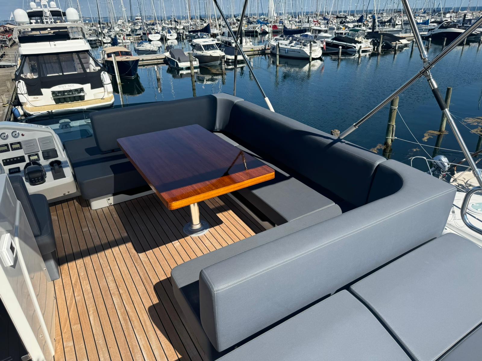 Ønsker du den optimale live-on-board båd med masser af plads og en flybridge som i størrelse minder om en 55′ fods båd er Cranchi T43 ét af de bedste valg. Den er perfekt til medium og lange sejlture eller til bare at opholde sig i. Cockpittet er dejlig stort med sofagruppe agter og stort sammenklappeligt teakbord.