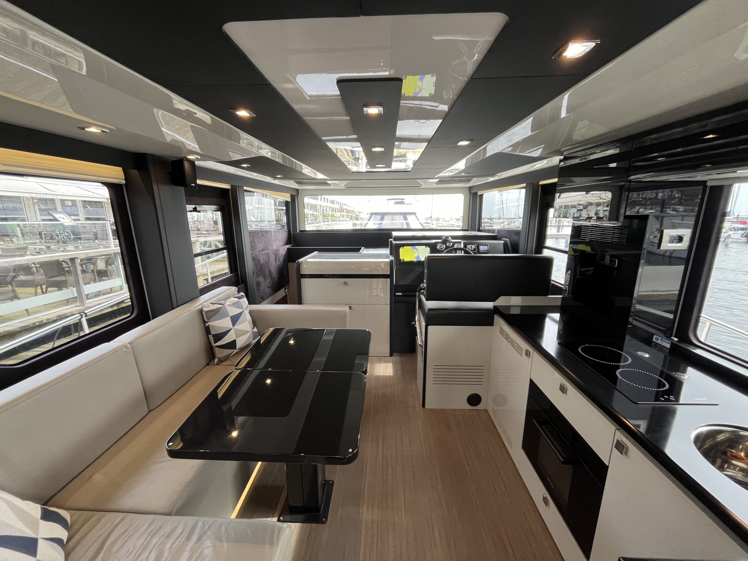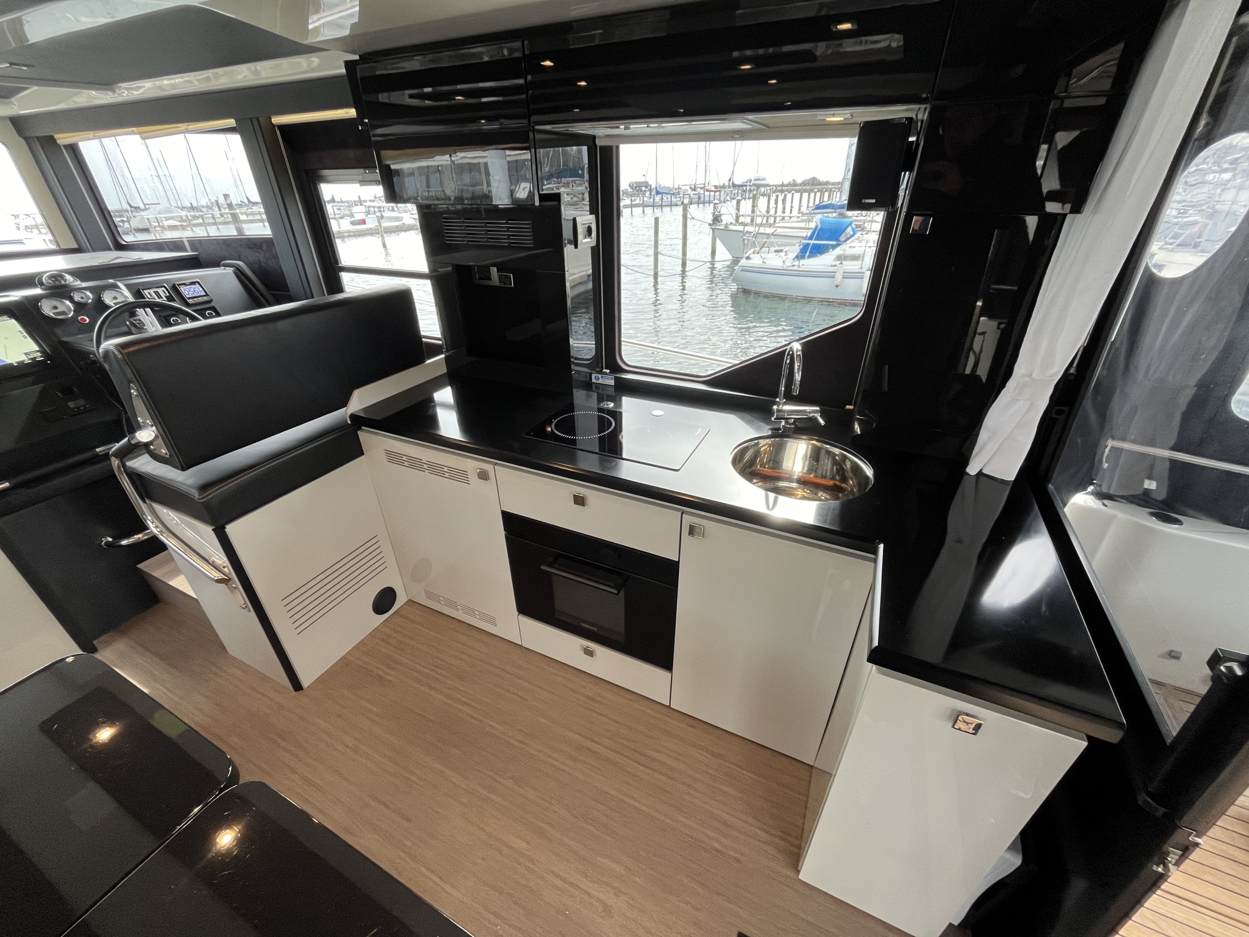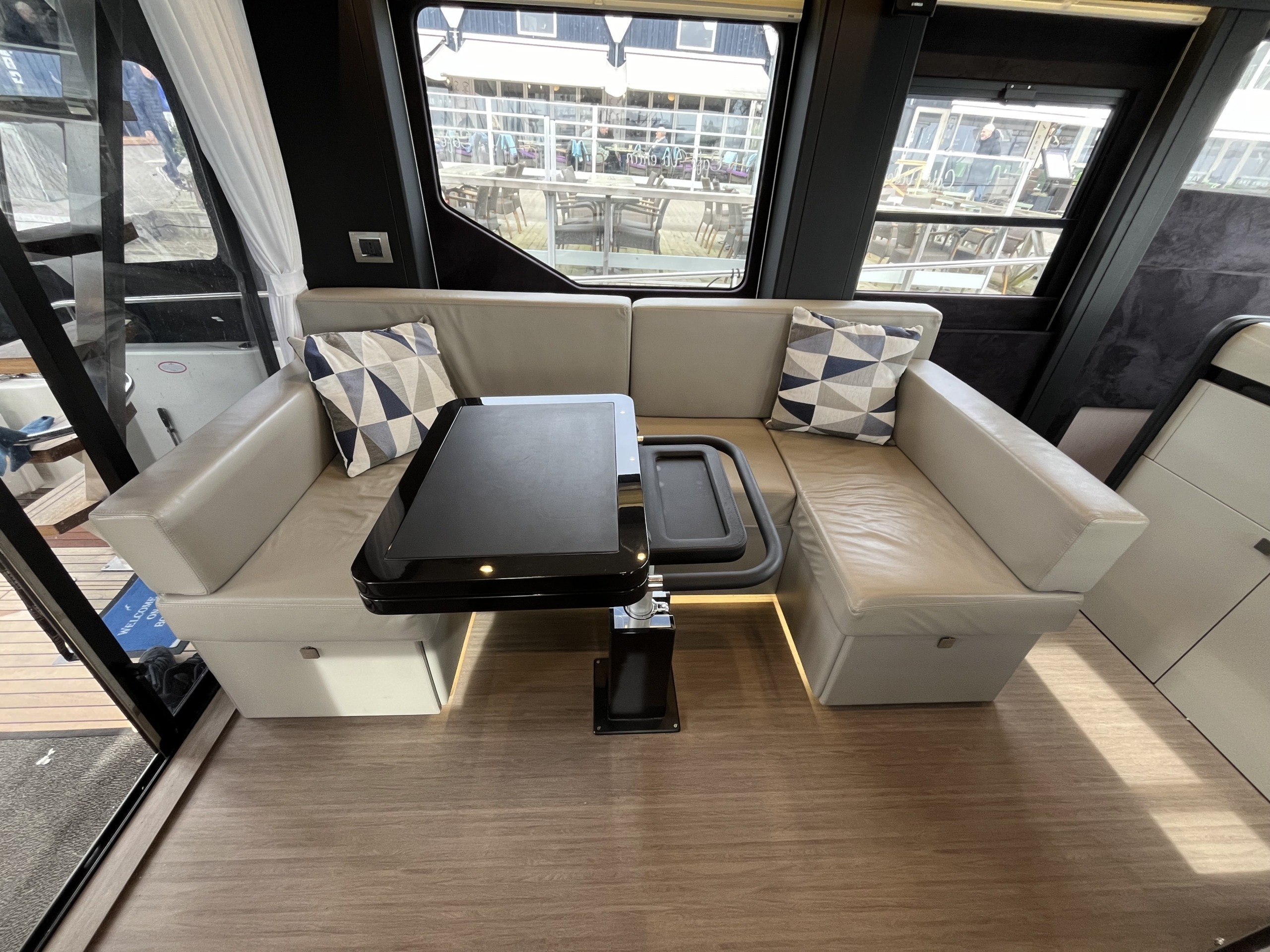 Der kan åbnes helt op til det velfungerende pantry, som har alt, hvad der er behov for inkl. multiovn. I bagbord side pæn U-sofa omkring bord. Bordet kan køres ned om omdannes til extra seng til 2 personer. TV inkl. stort lydsystem m.m.