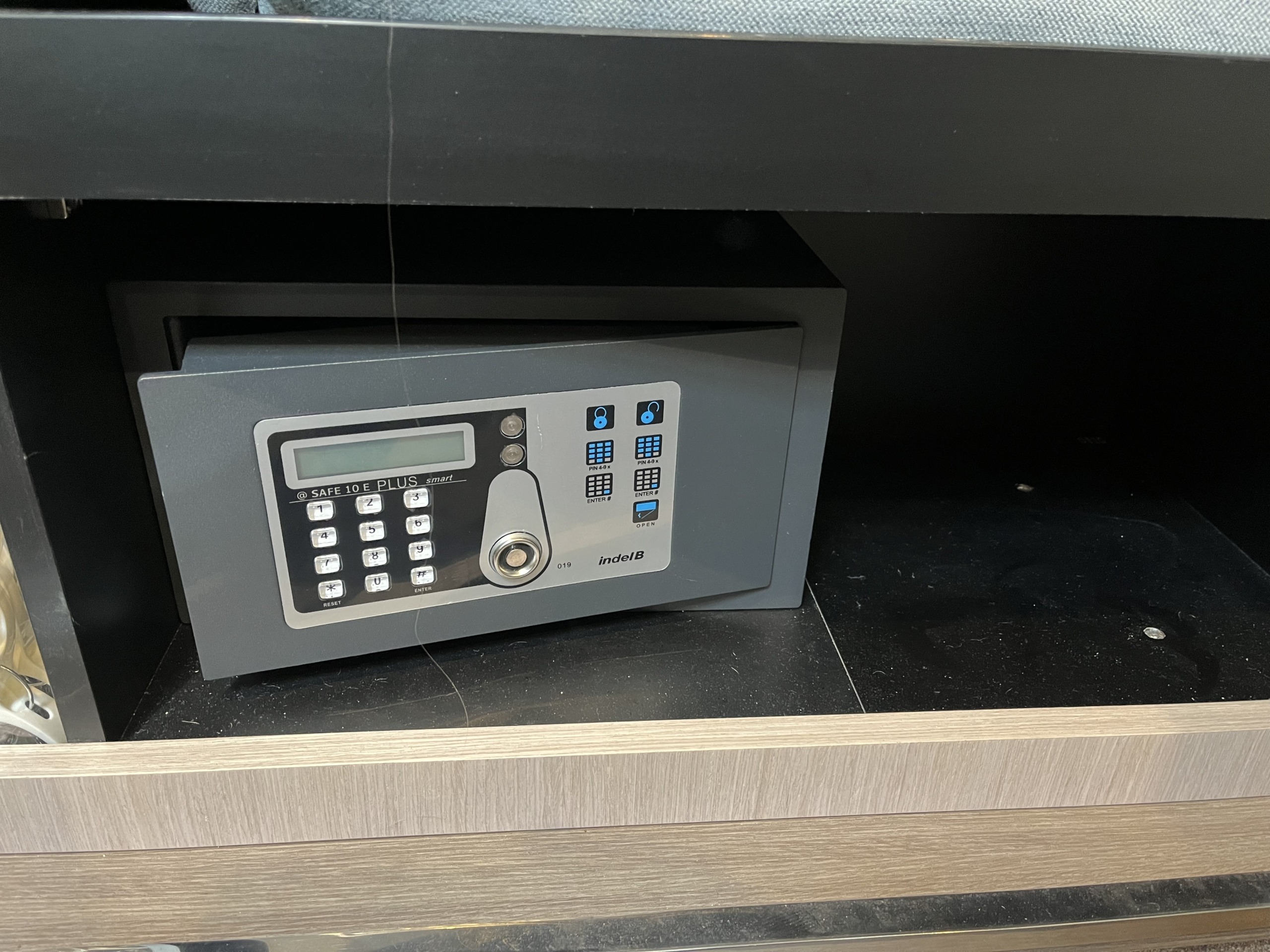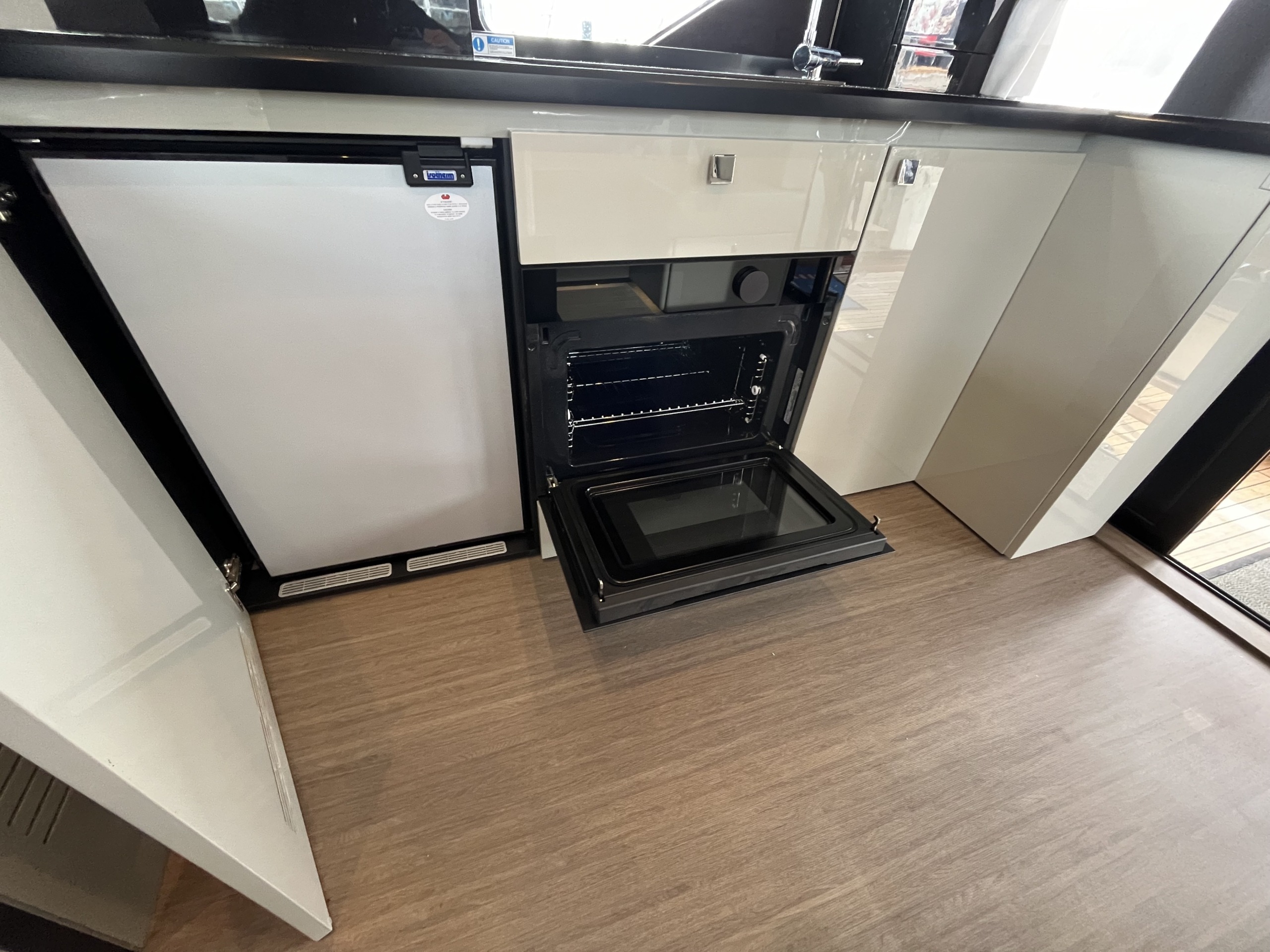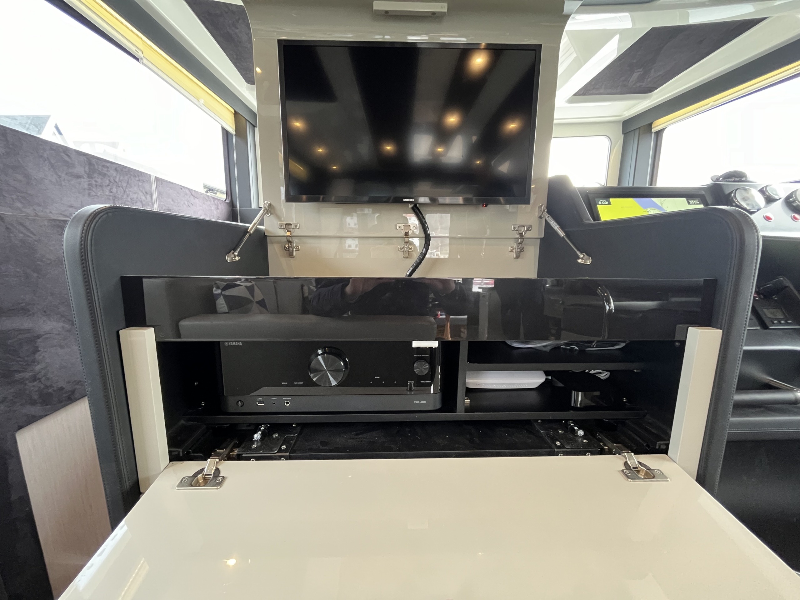 It can be opened all the way up to the well-functioning pantry, which has everything you need, incl. multi oven. On the port side, a nice U-shaped sofa around the table. The table can be rolled down and converted into an extra bed for 2 people. TV incl. large sound system, etc.