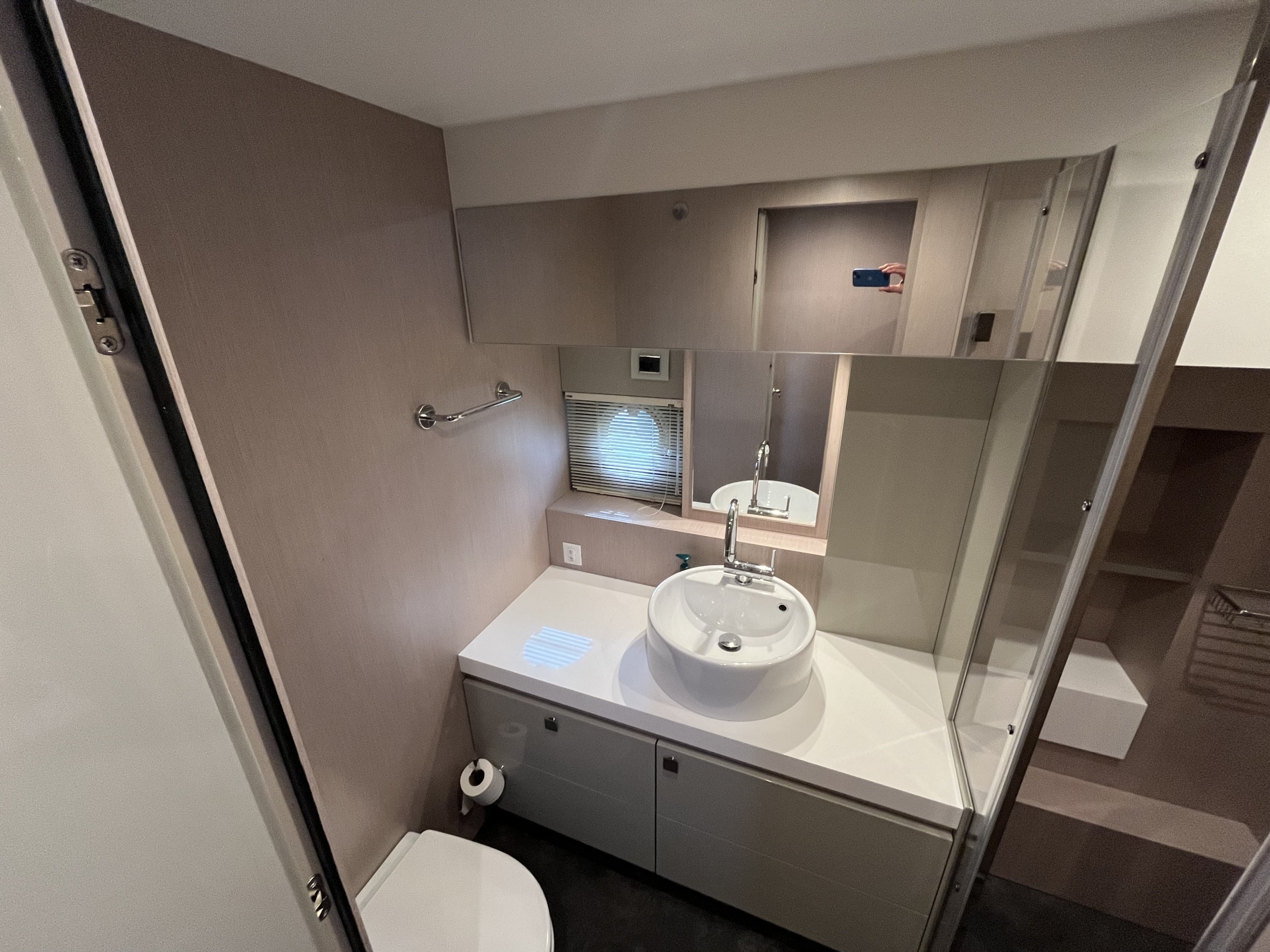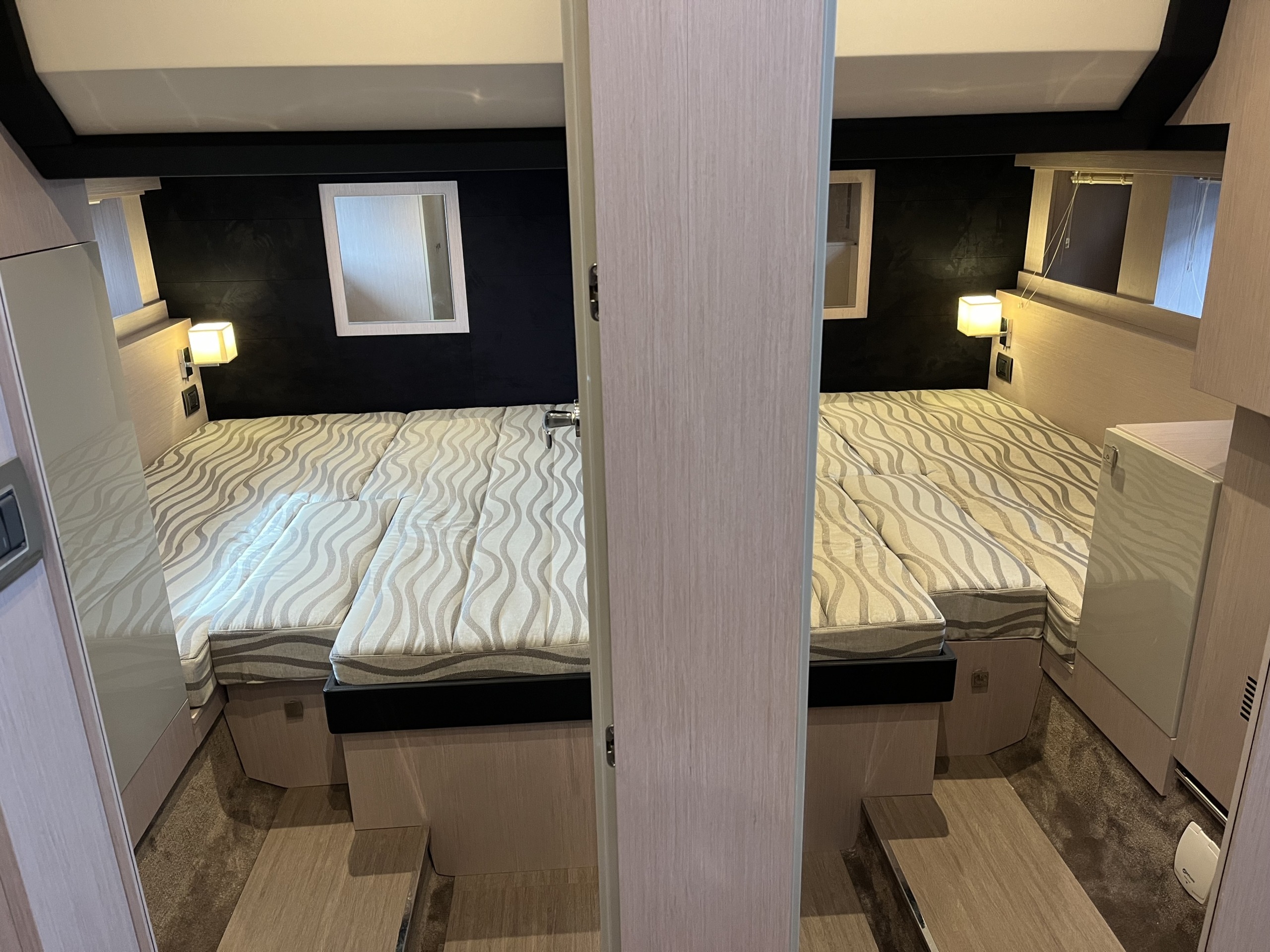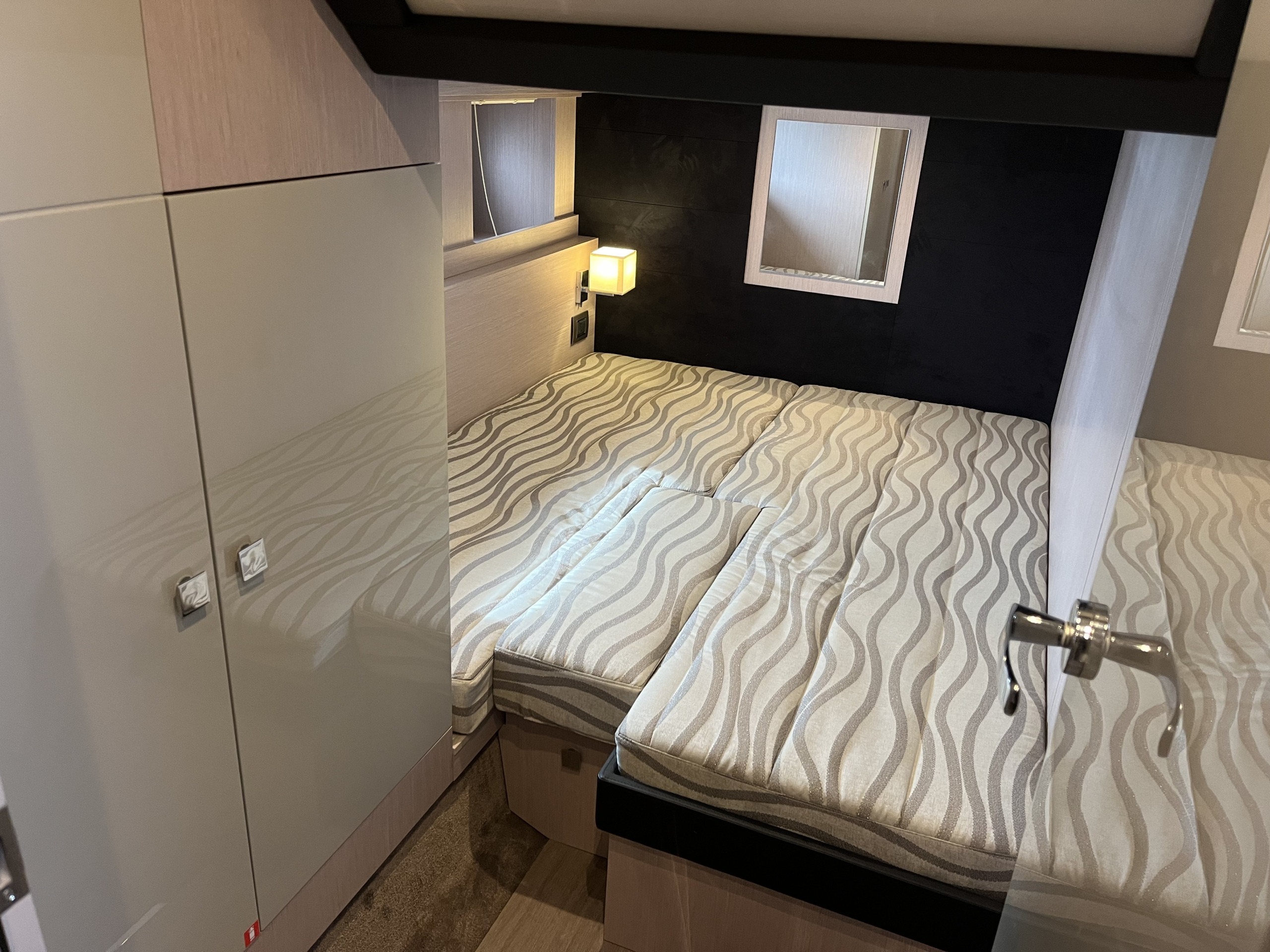 The helm has a good view and seating for two. Below three large and well-functioning cabins. The master cabin with a nice large double bed and good cupboards on the sides (one with a safe) as well as its own toilet and shower. The two aft cabins are also nicely large, each with their own double bed.