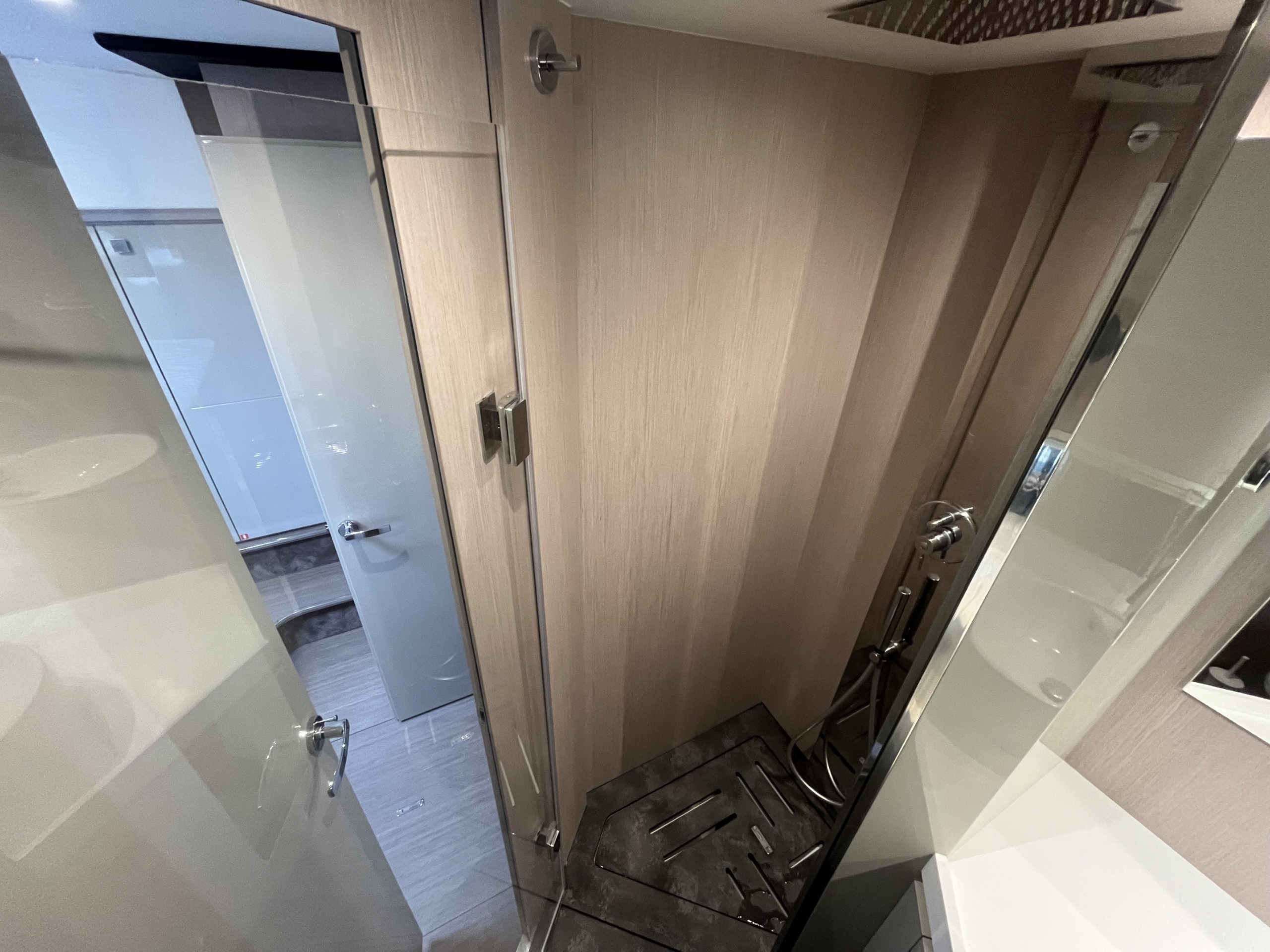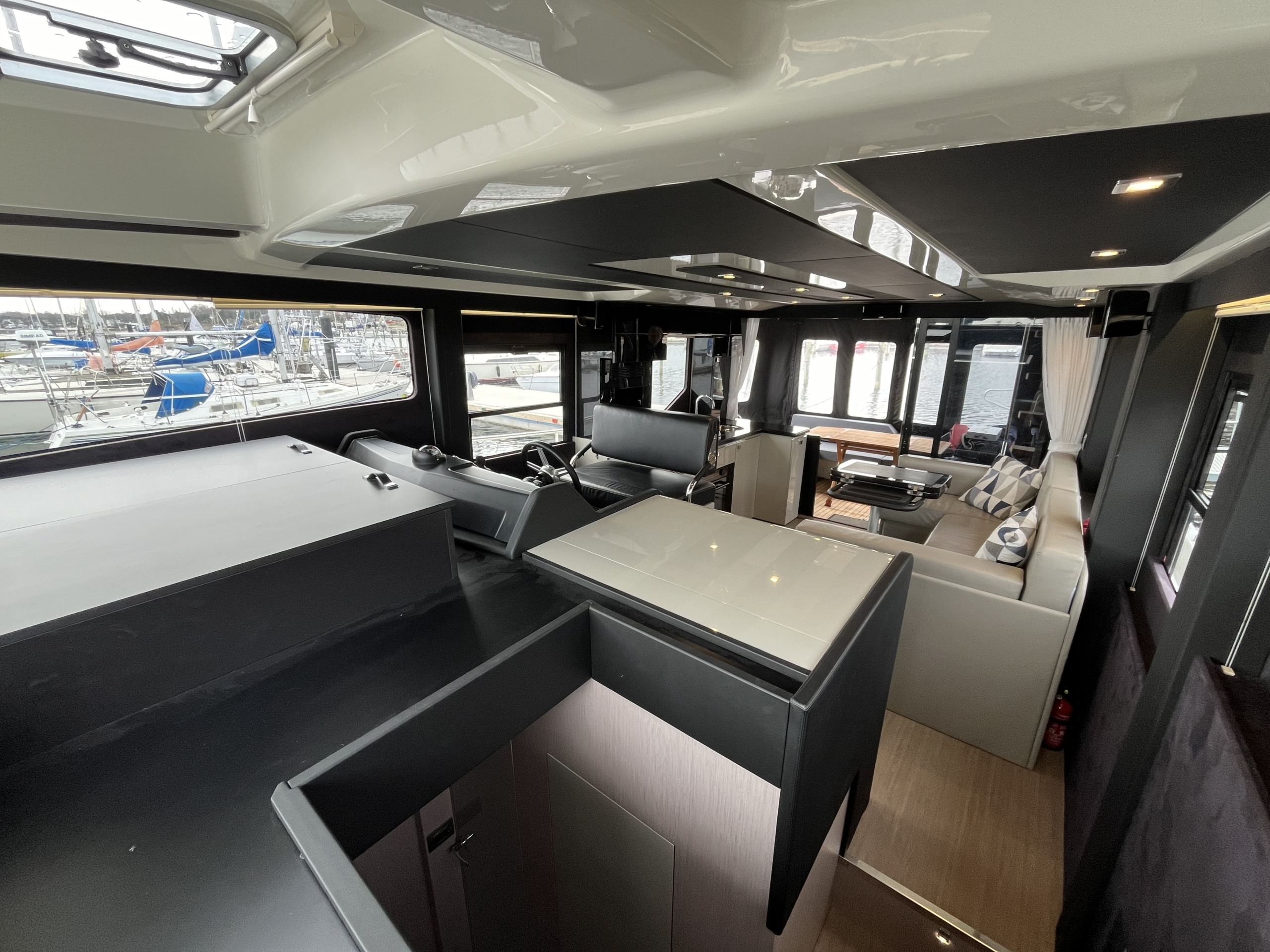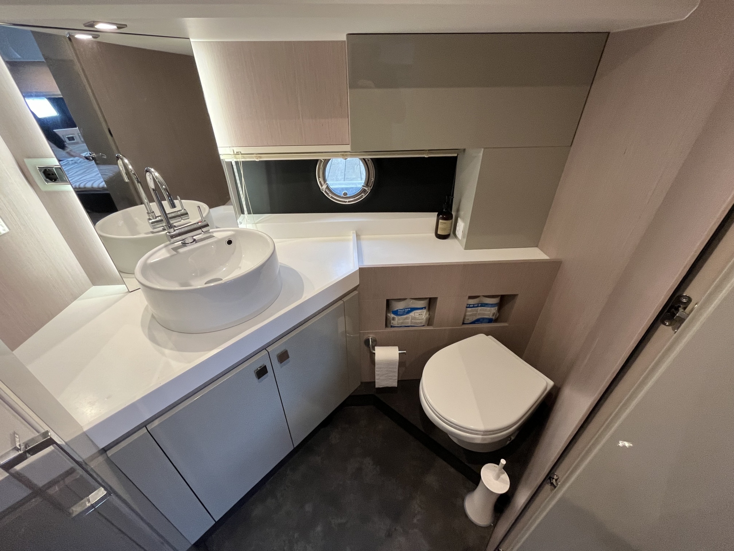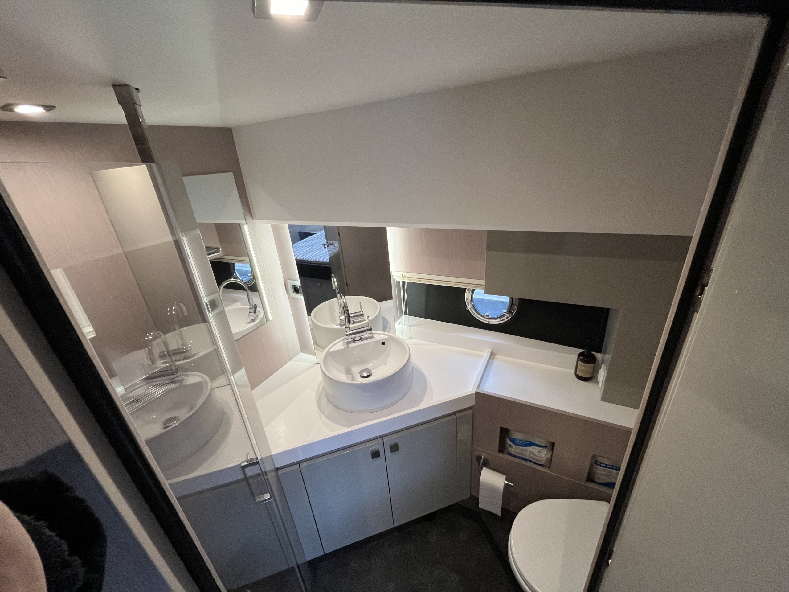 The helm has a good view and seating for two. Below three large and well-functioning cabins. The master cabin with a nice large double bed and good cupboards on the sides (one with a safe) as well as its own toilet and shower. The two aft cabins are also nicely large, each with their own double bed.
