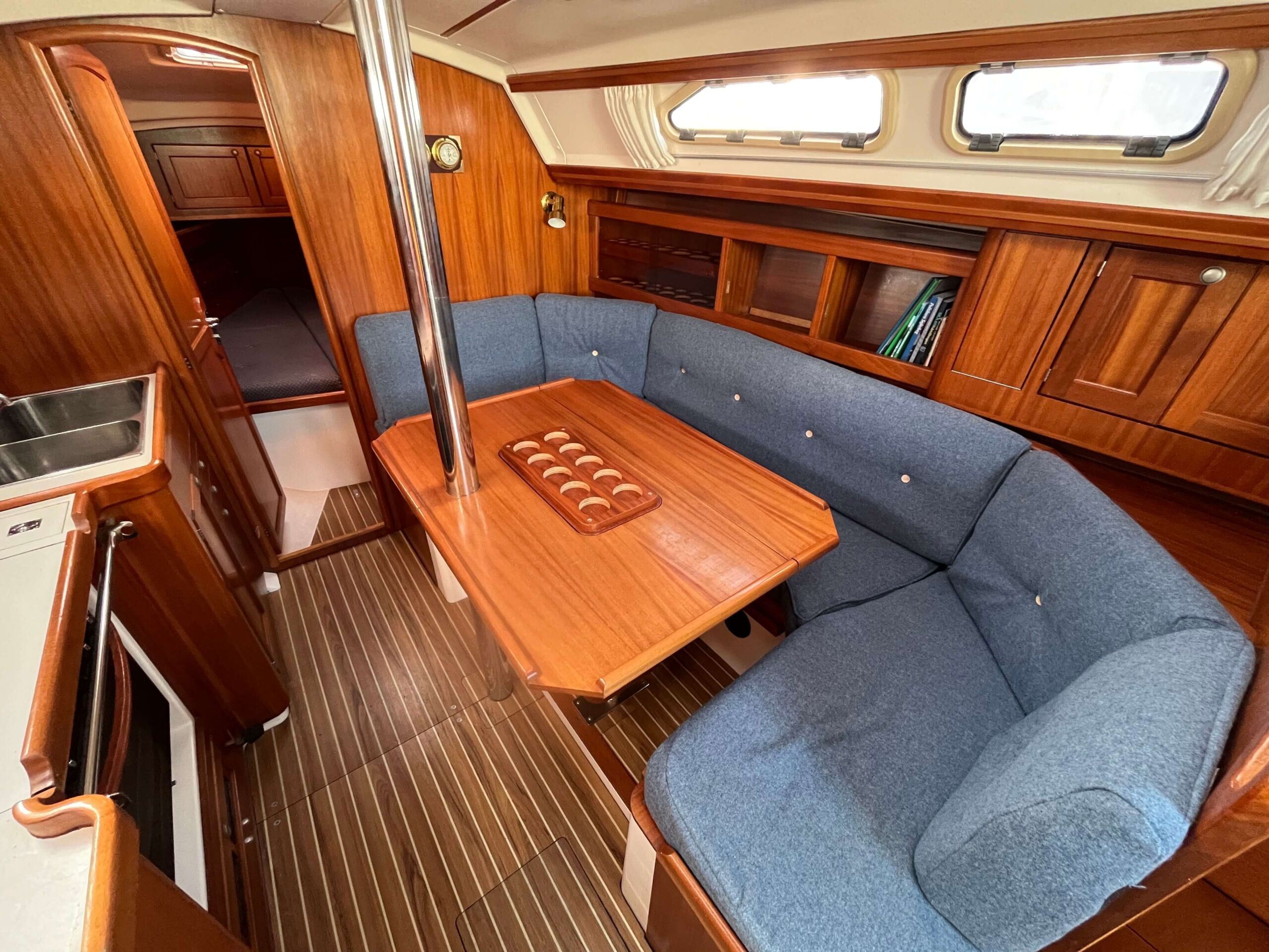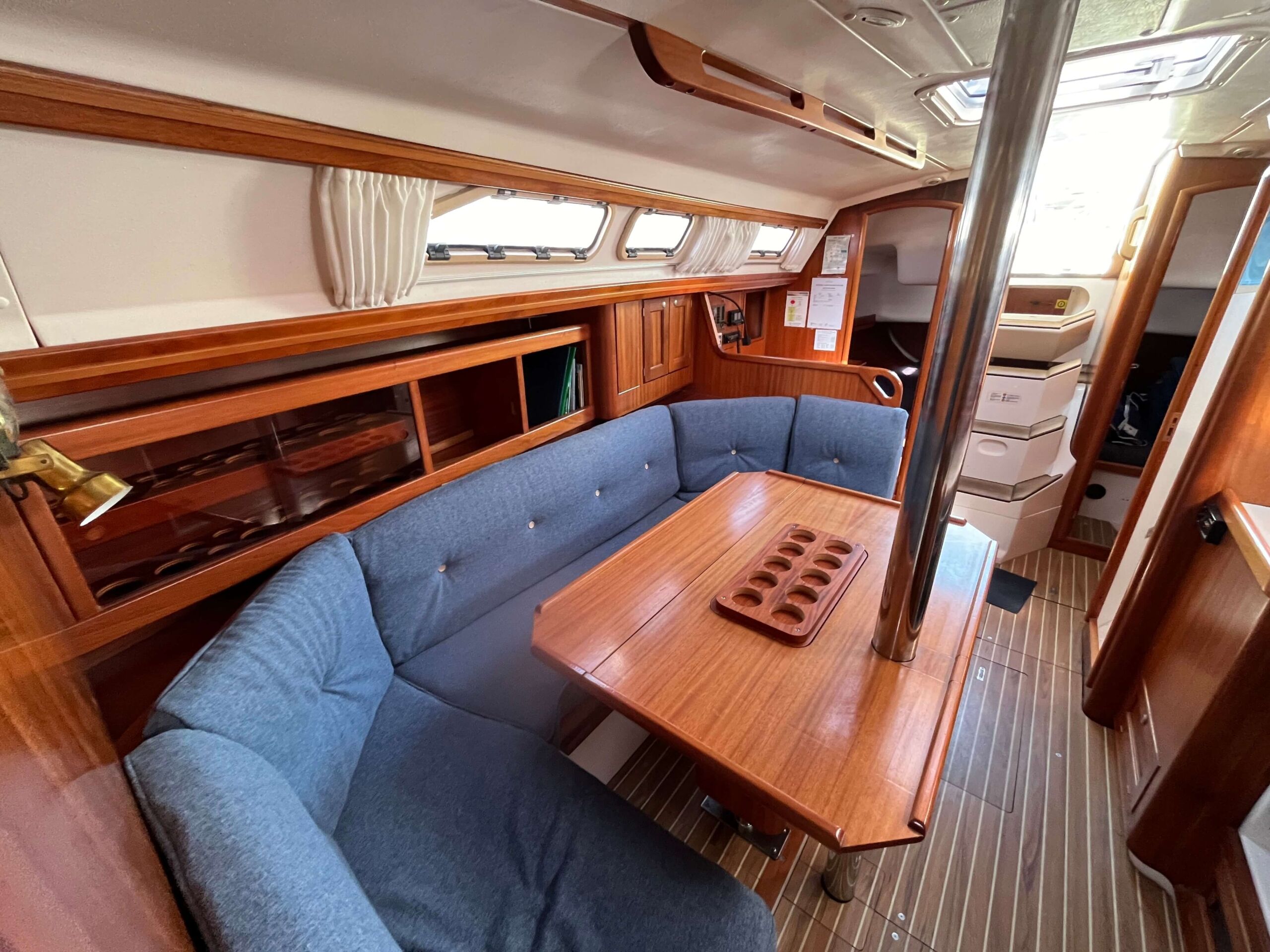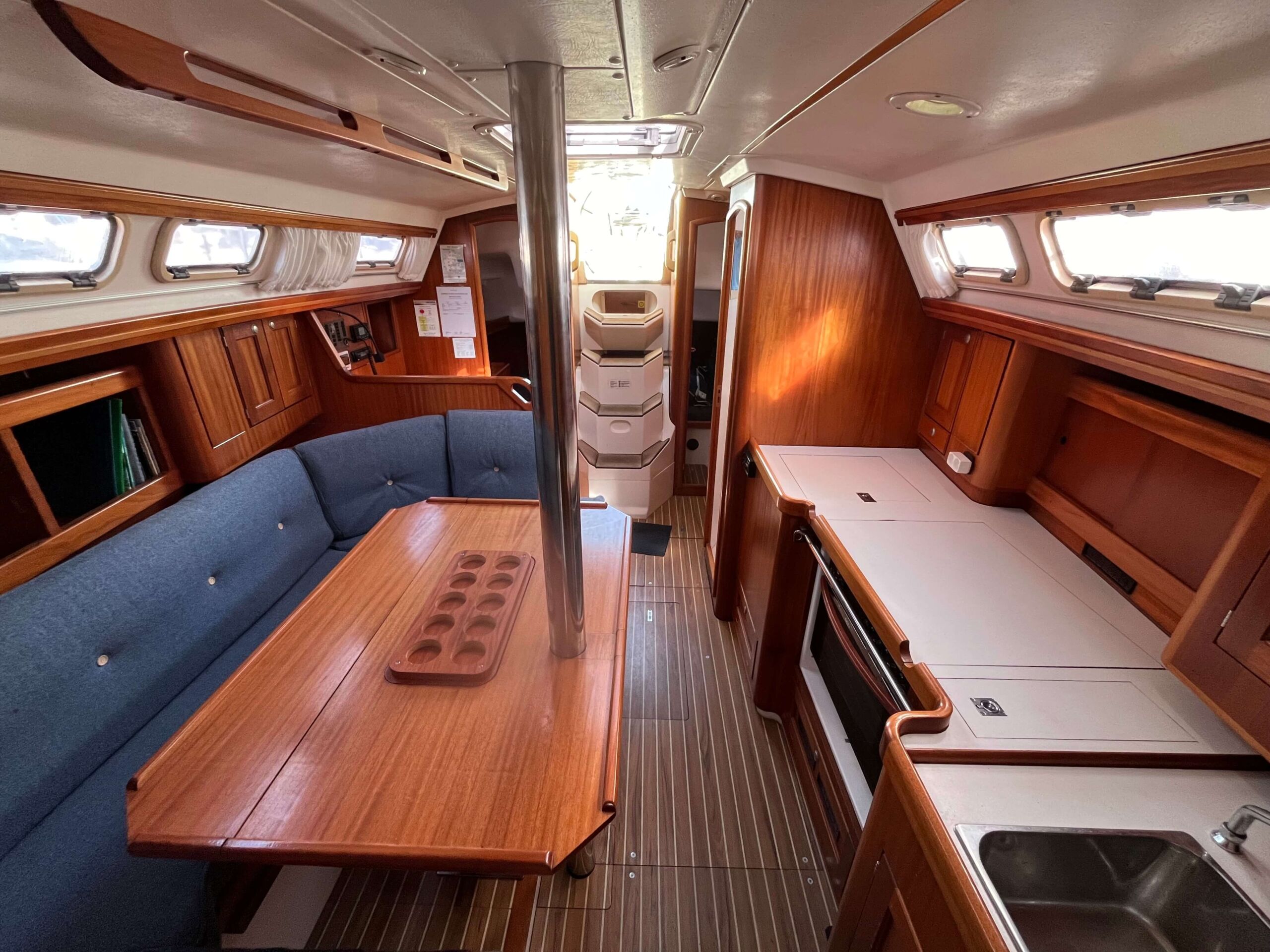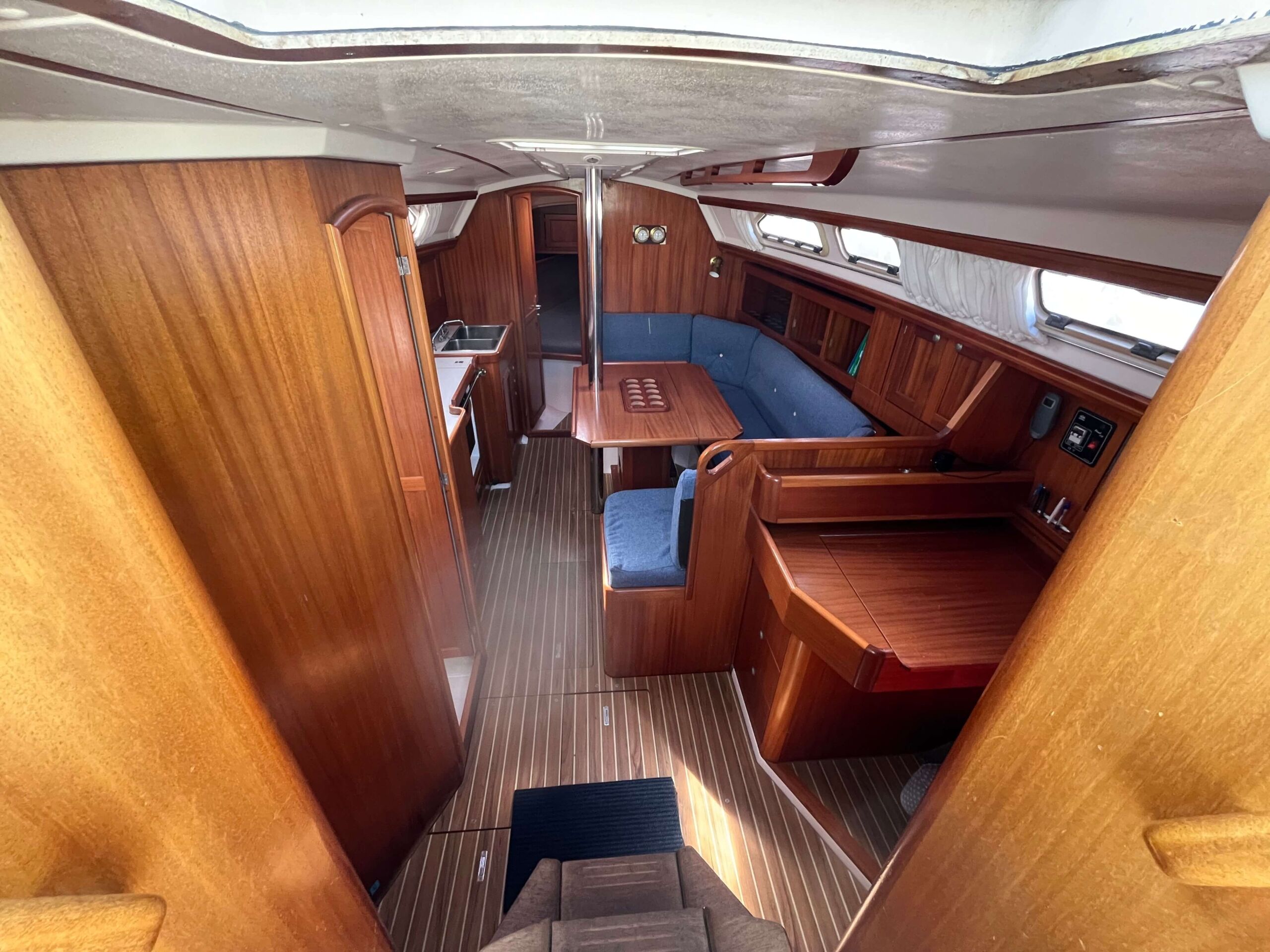 Dette er en meget fin båd med tre gode kahytter, salon med pantry og et separat toilet baderum. Godt og velfungerende pantry i BB side. I SB navigationsbord samt stor og veludnyttet U-sofa rundt om stort salon bord. I stævnen findes en fin kahyt med dobbelt soveplads og agter to gode rummelig agterkahytter med dobbelt soveplads i begge