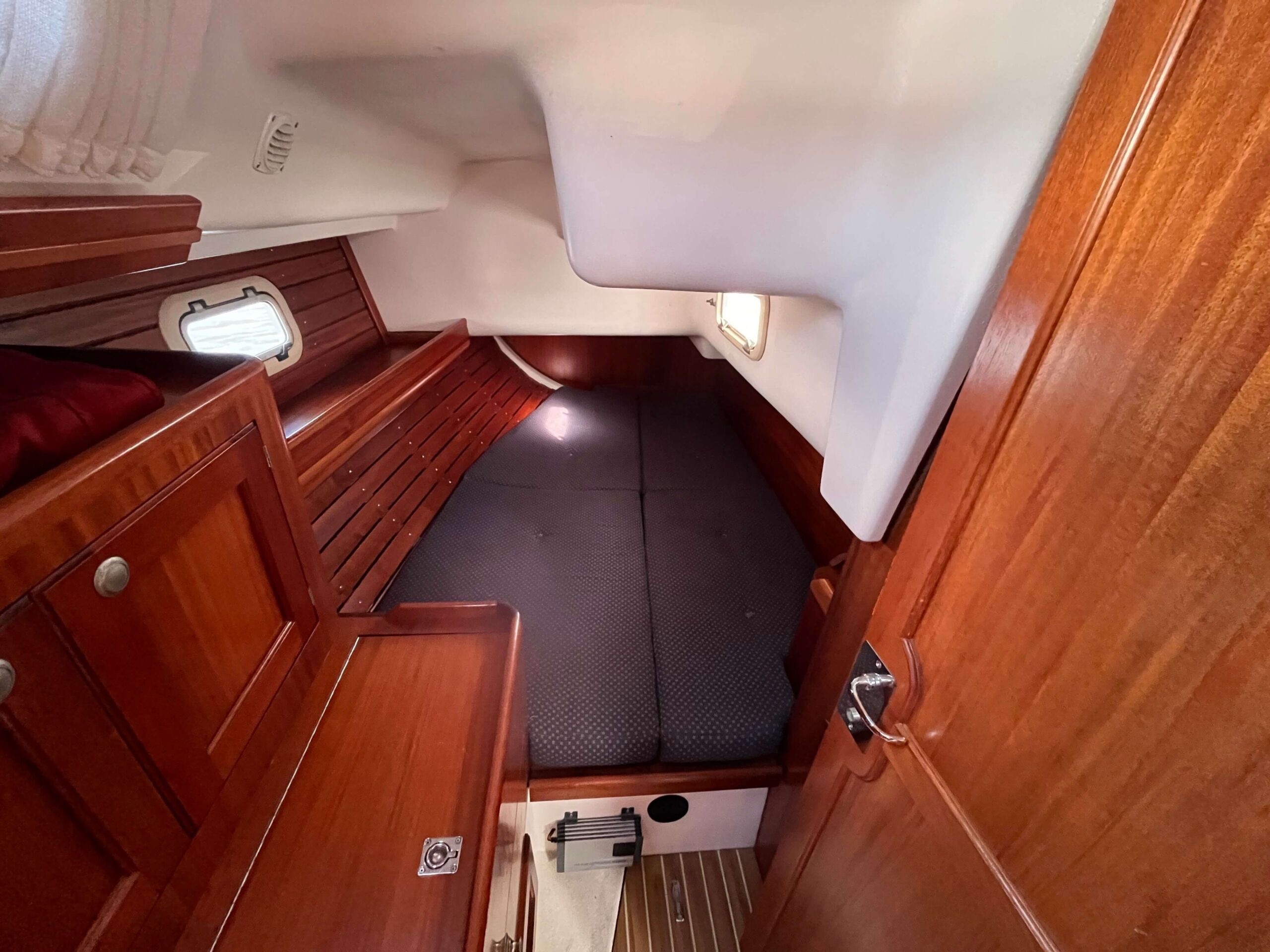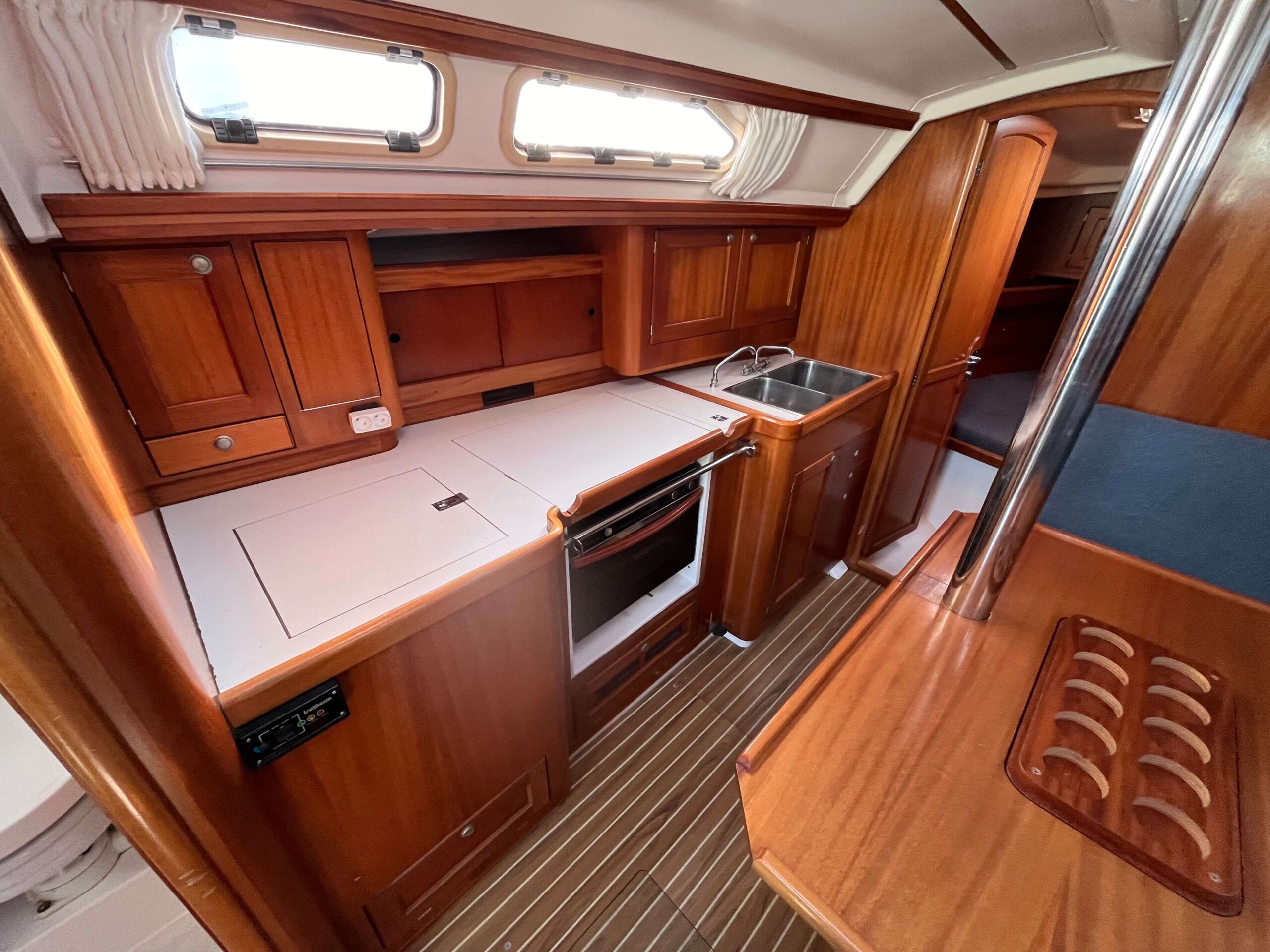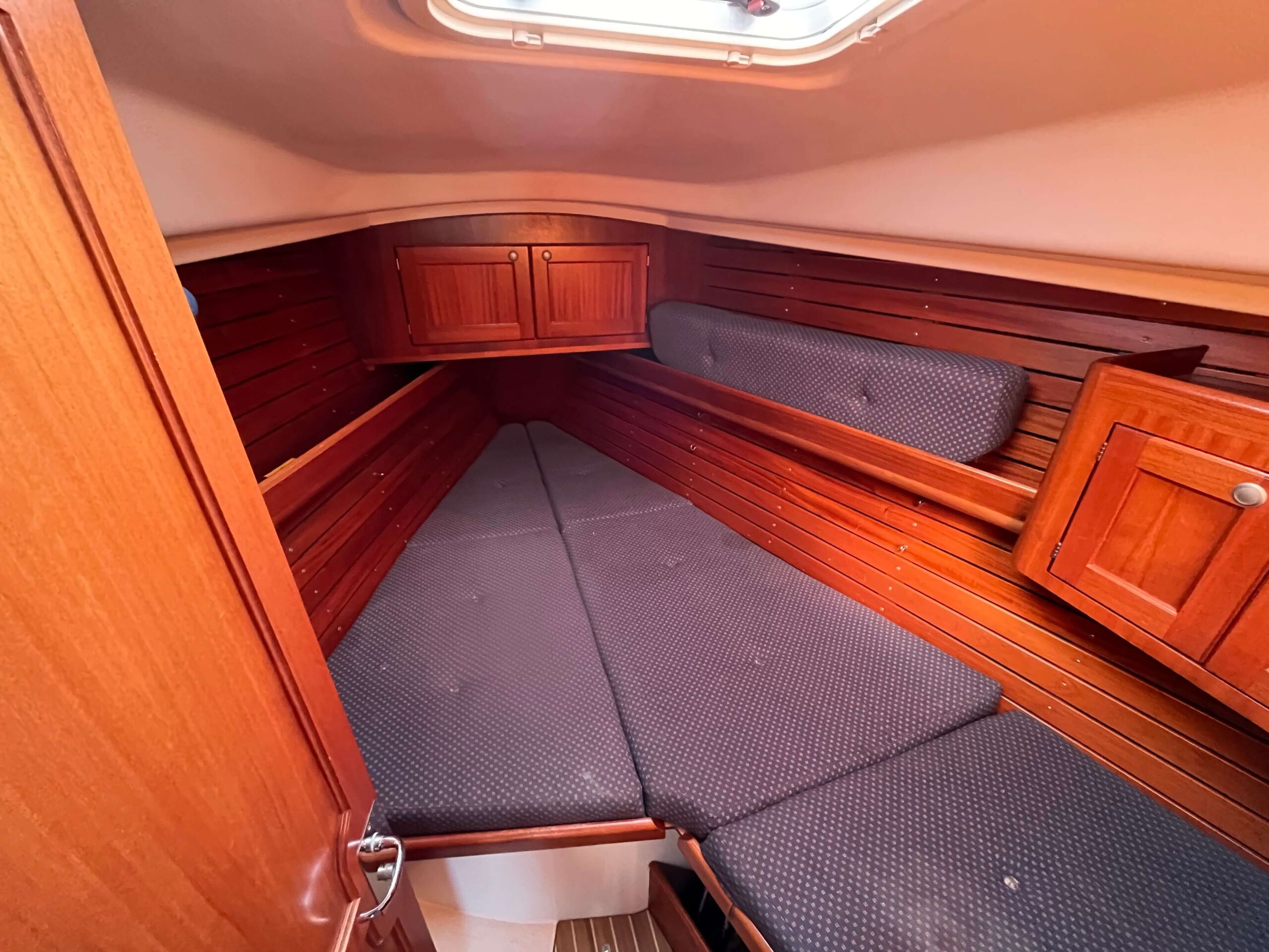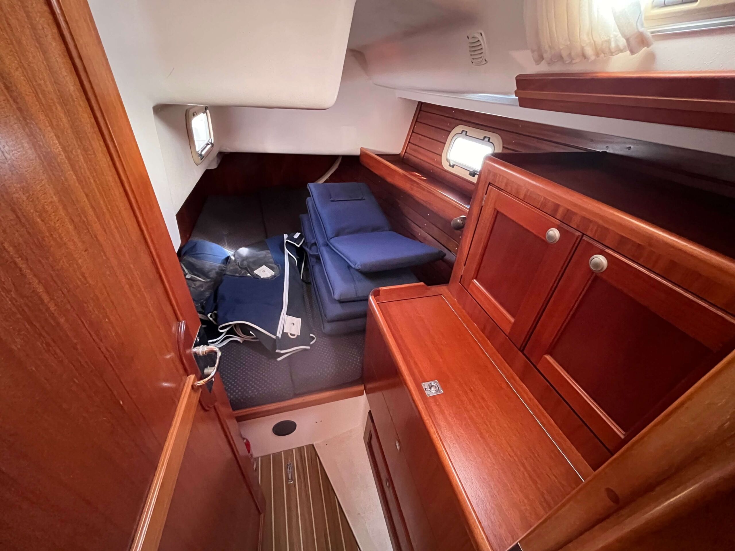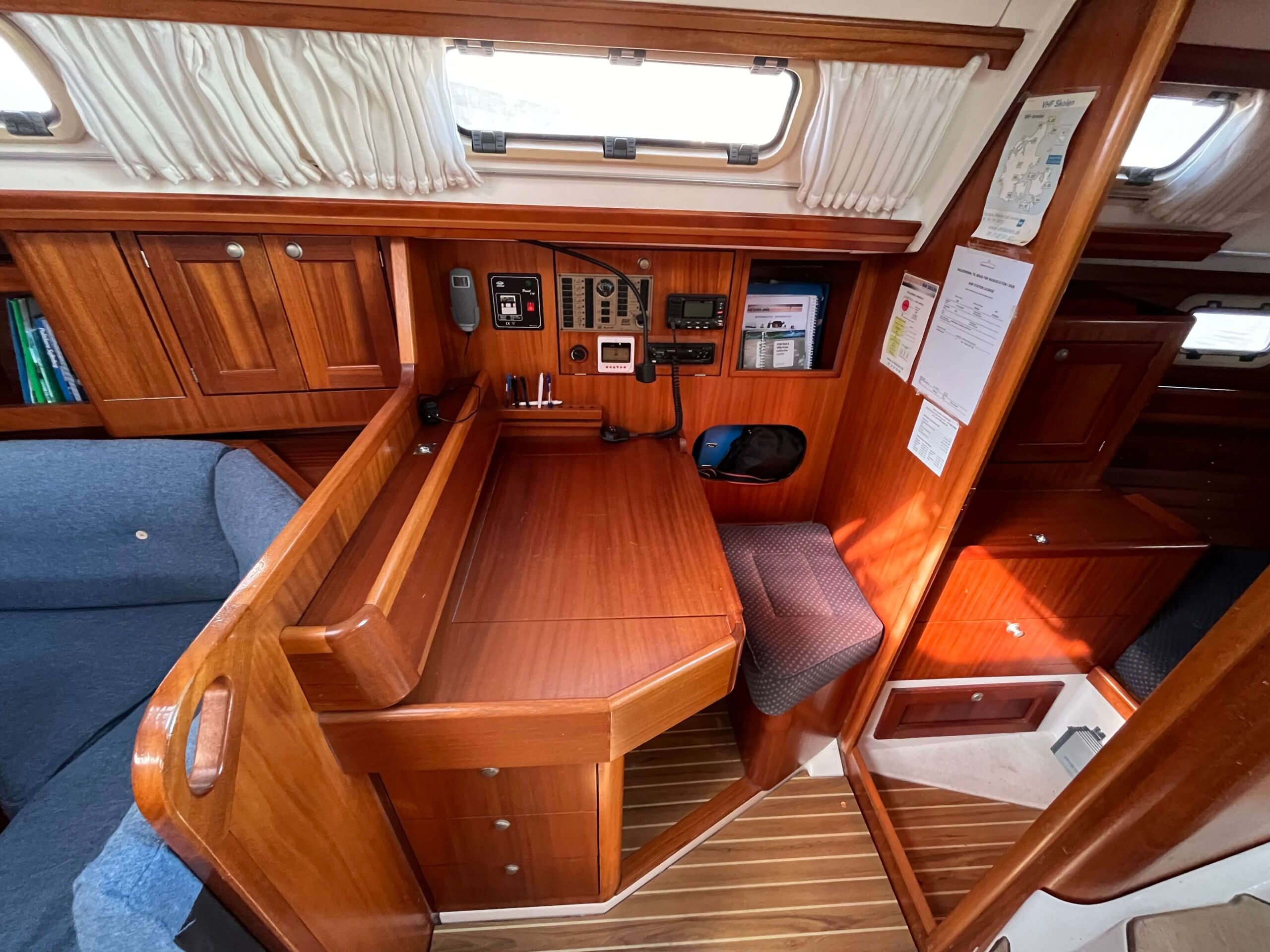 Dette er en meget fin båd med tre gode kahytter, salon med pantry og et separat toilet baderum. Godt og velfungerende pantry i BB side. I SB navigationsbord samt stor og veludnyttet U-sofa rundt om stort salon bord. I stævnen findes en fin kahyt med dobbelt soveplads og agter to gode rummelig agterkahytter med dobbelt soveplads i begge