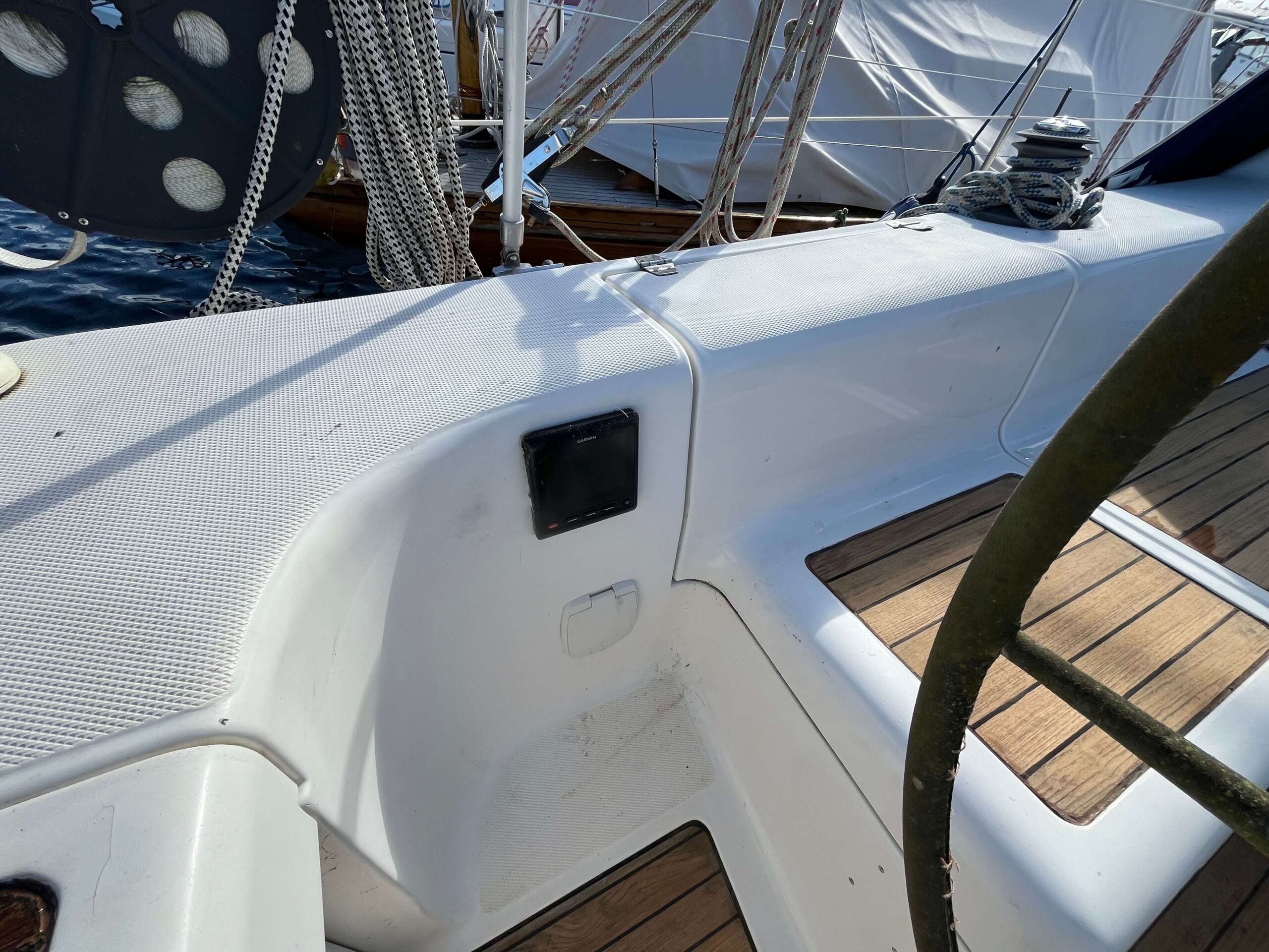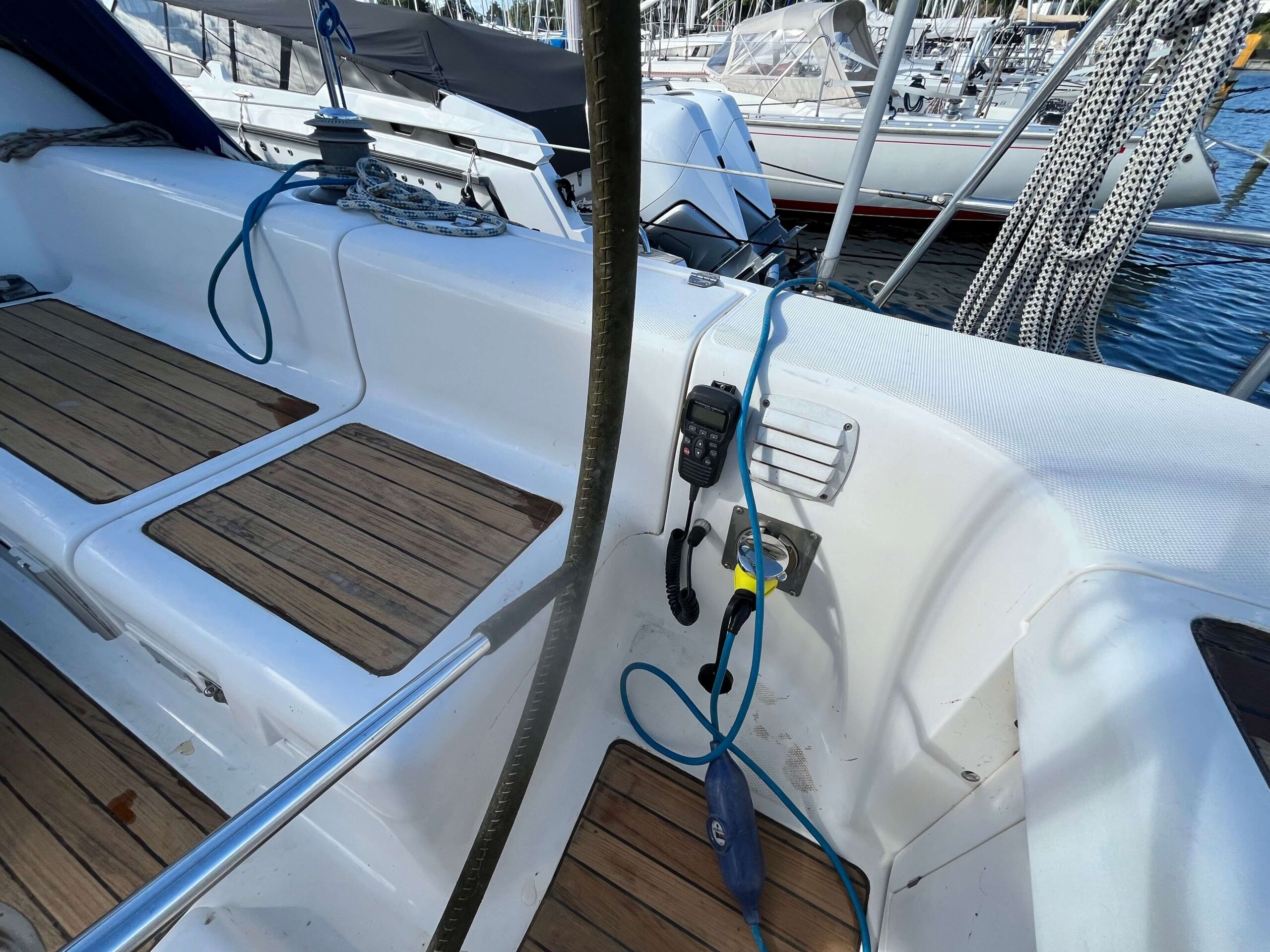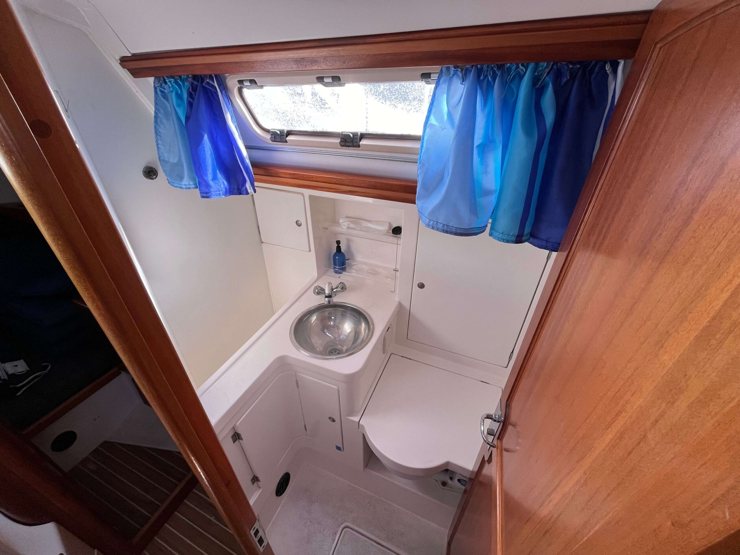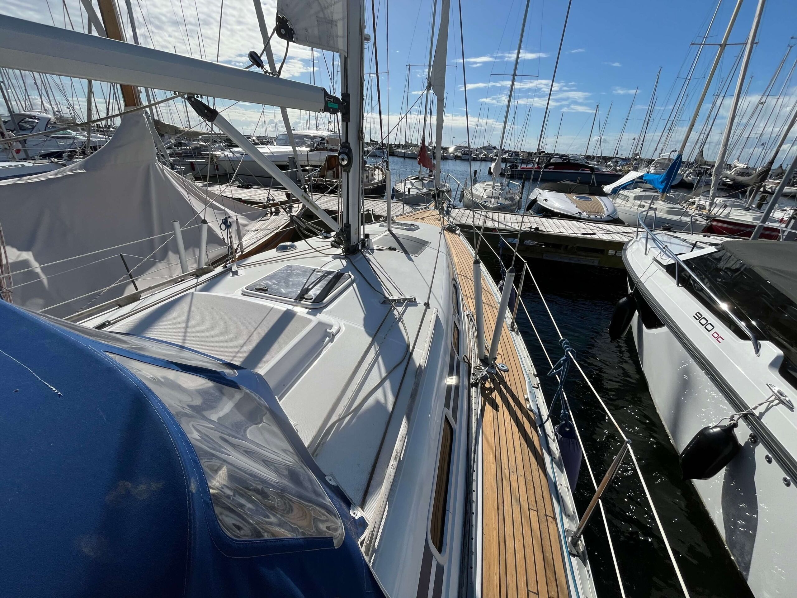 Dette er en meget fin båd med tre gode kahytter, salon med pantry og et separat toilet baderum. Godt og velfungerende pantry i BB side. I SB navigationsbord samt stor og veludnyttet U-sofa rundt om stort salon bord. I stævnen findes en fin kahyt med dobbelt soveplads og agter to gode rummelig agterkahytter med dobbelt soveplads i begge