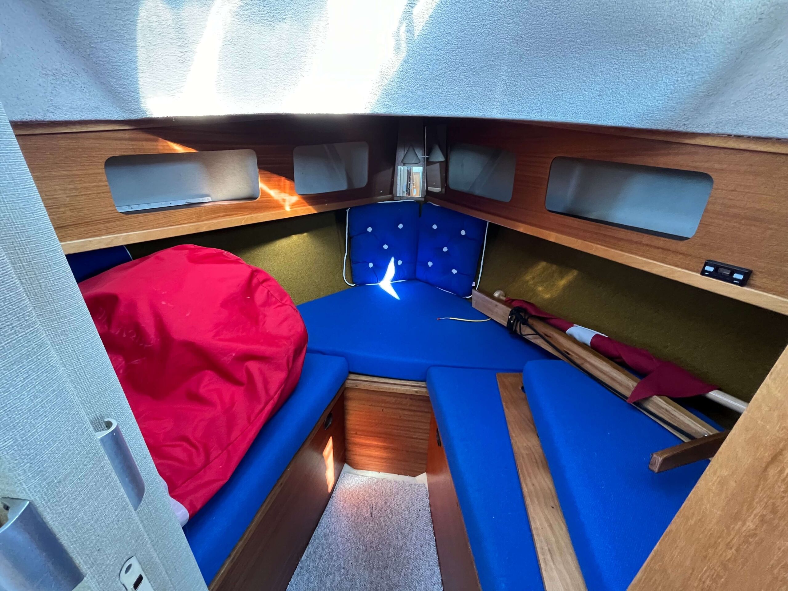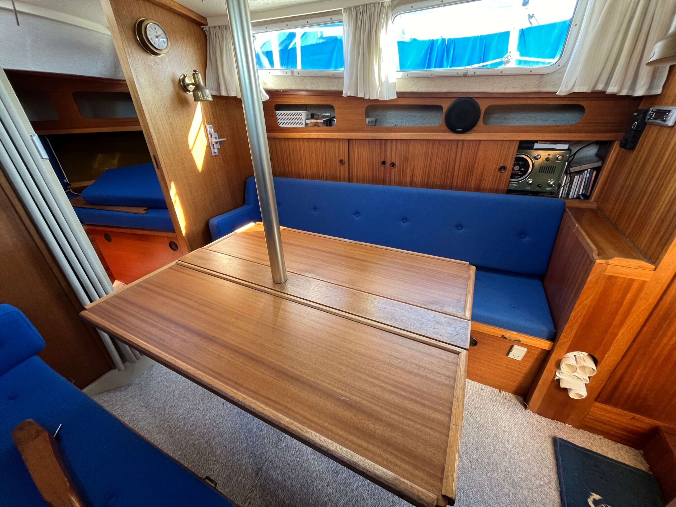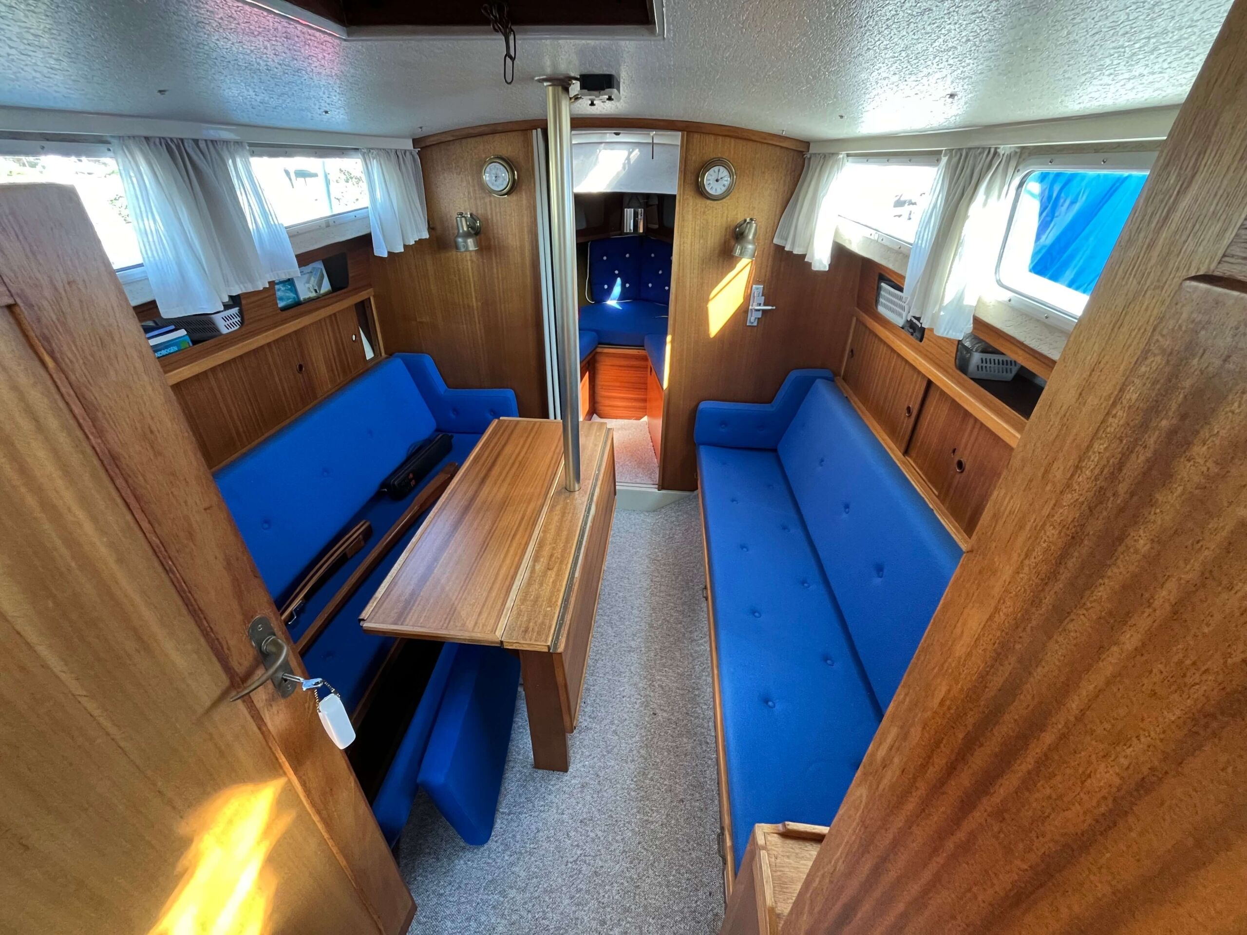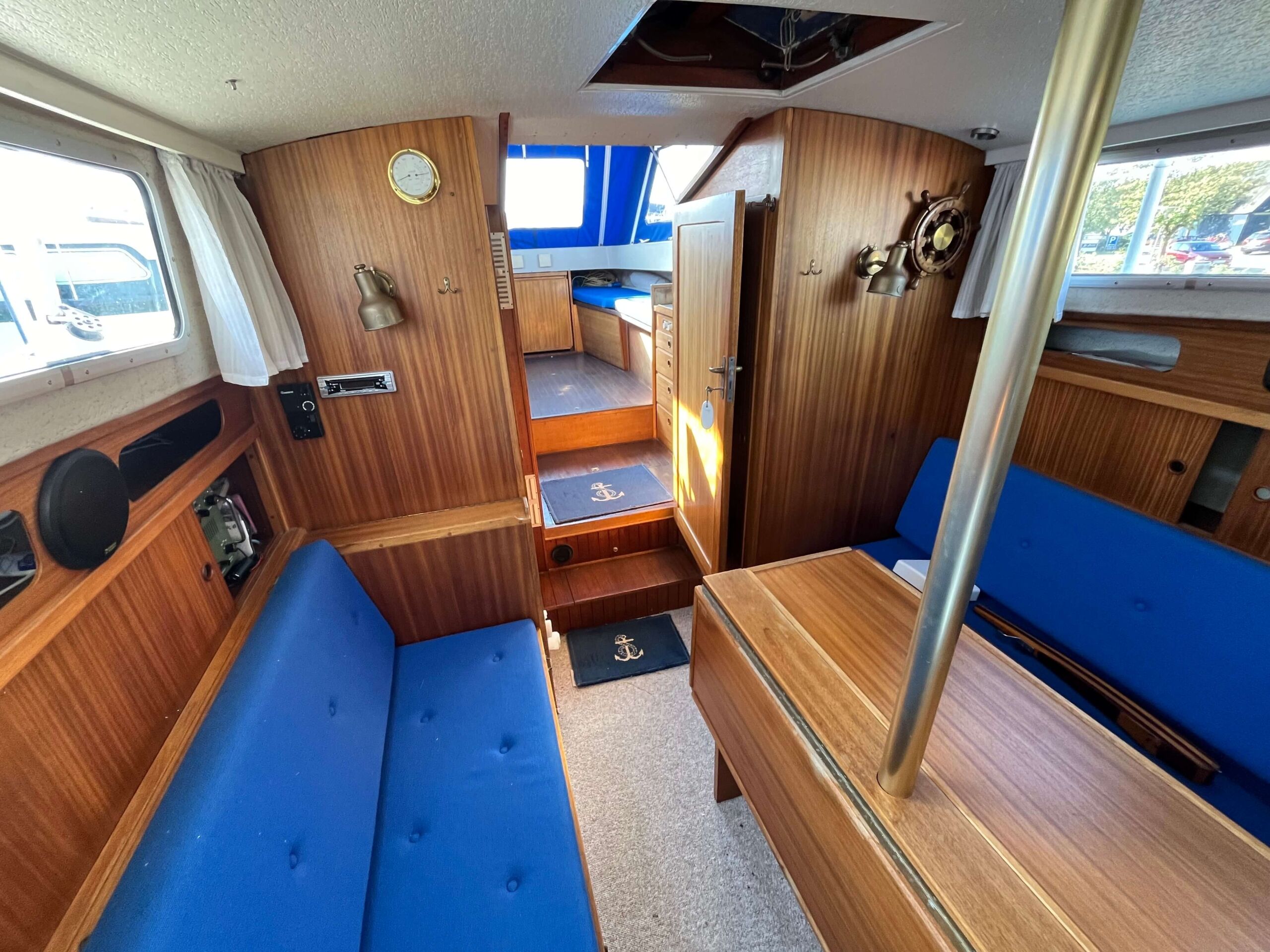 Traditionel indretning med forkahyt med 2 sovepladser, salon med separat toiletrum, højskab, siddepladser overfor hinanden, som kan omdannes til 2 x 2 sovepladser. Cockpit har styreplads med et godt udsyn, overfor køkken med vask og 2 kogeblus. Agter siddepladser overfor hinanden og bord, som kan foldes ud så man nemt kan sidde 6 personer og spise. En mindre båd, men meget stor rummelighed.