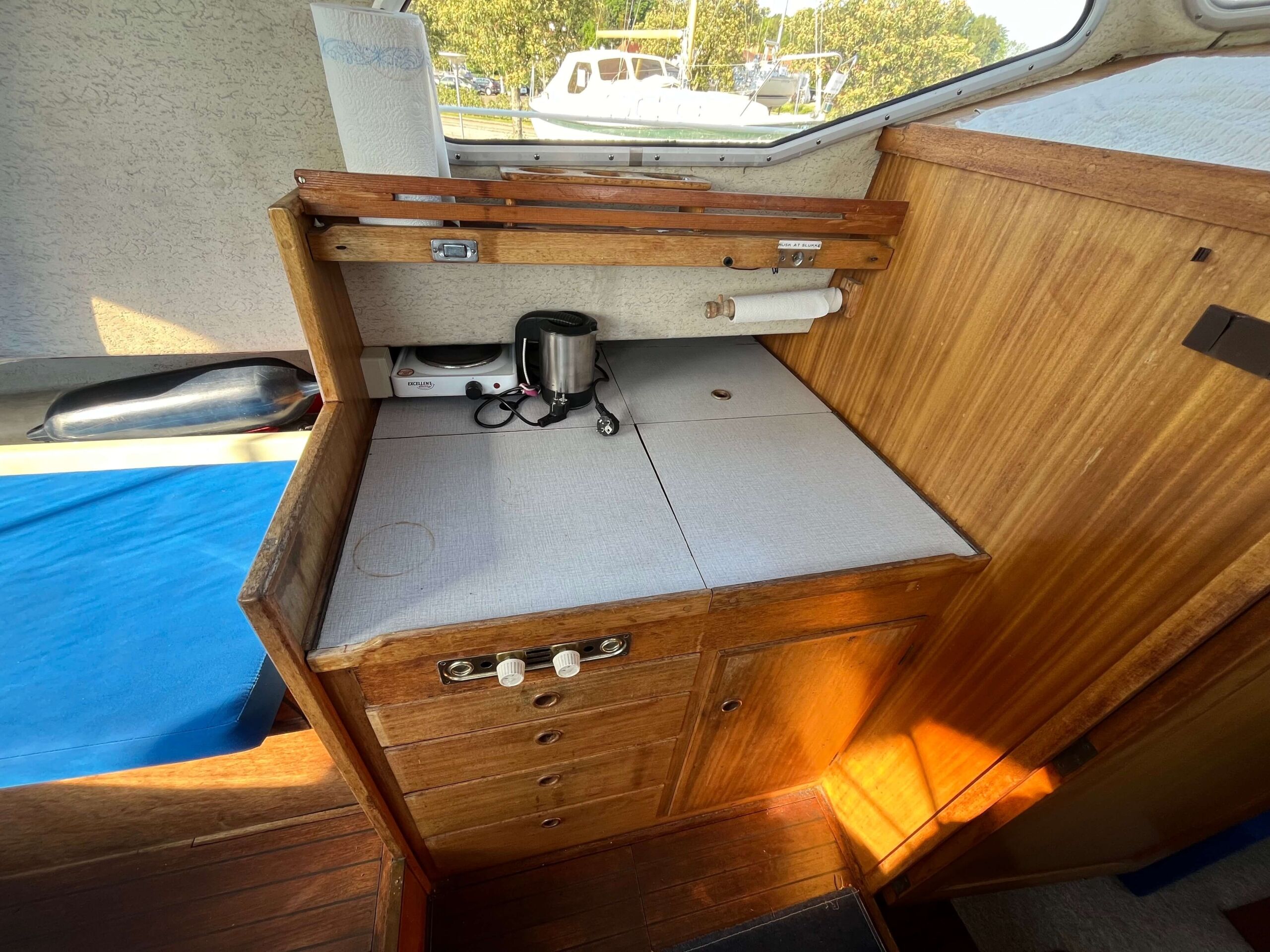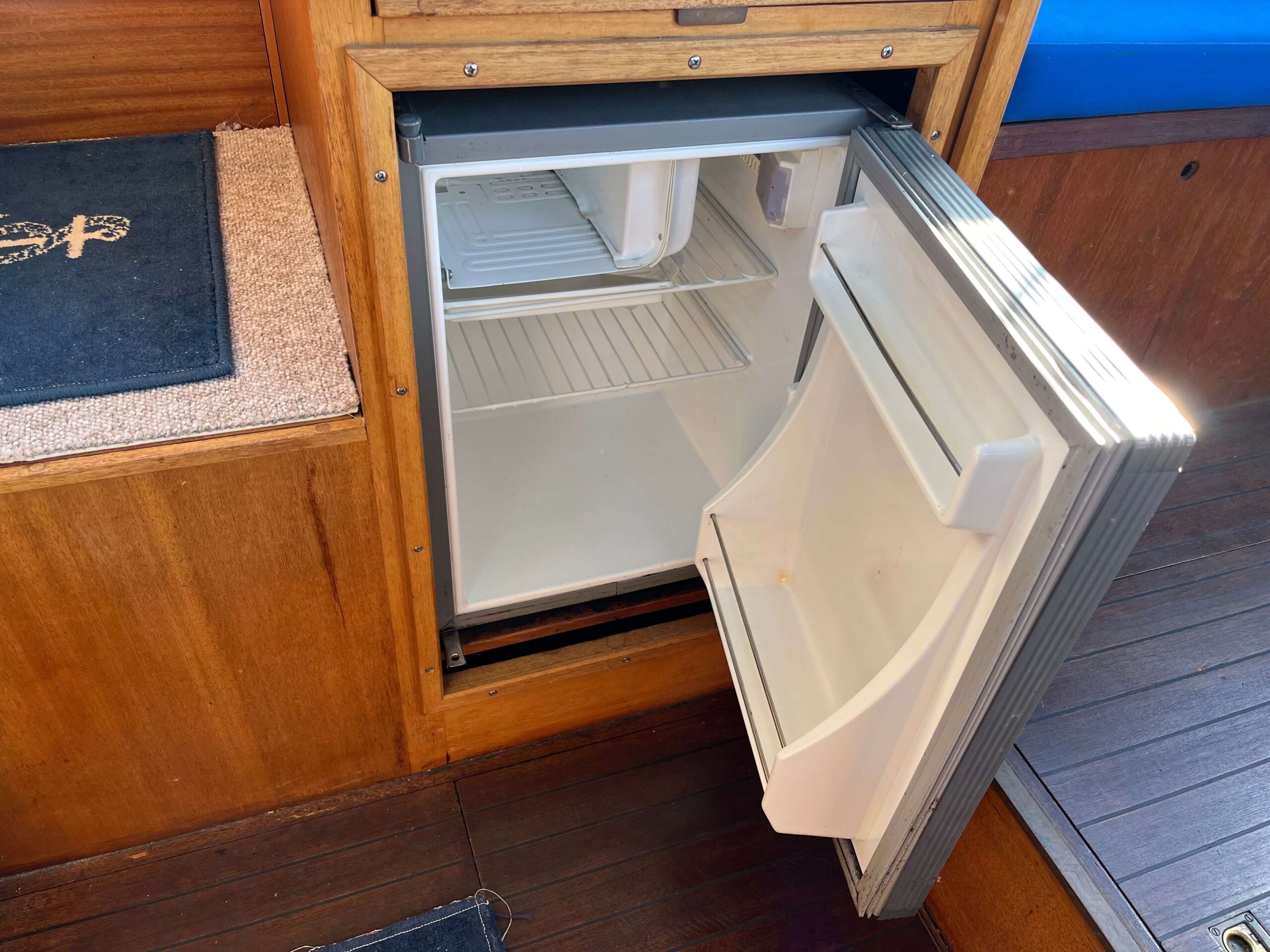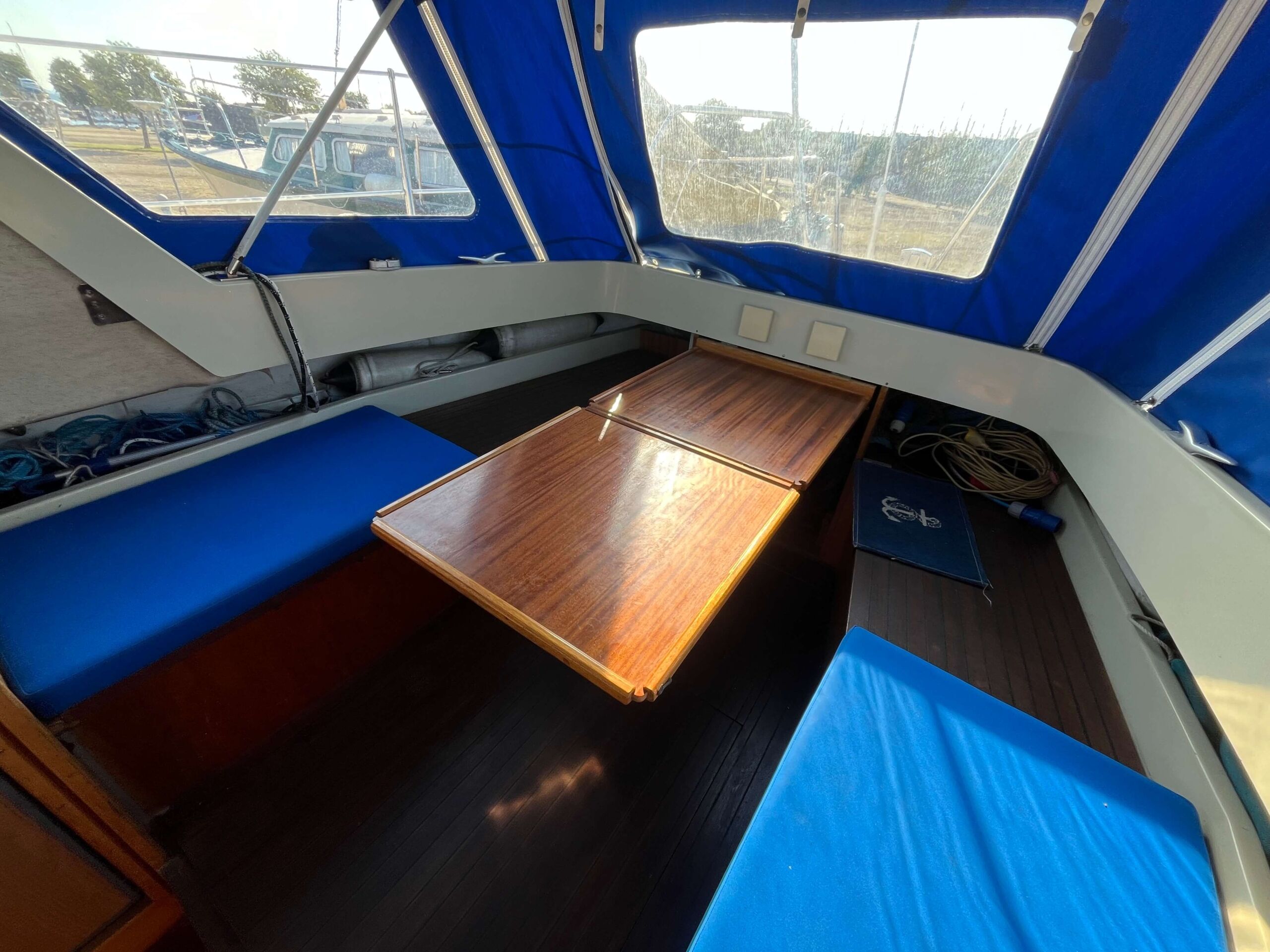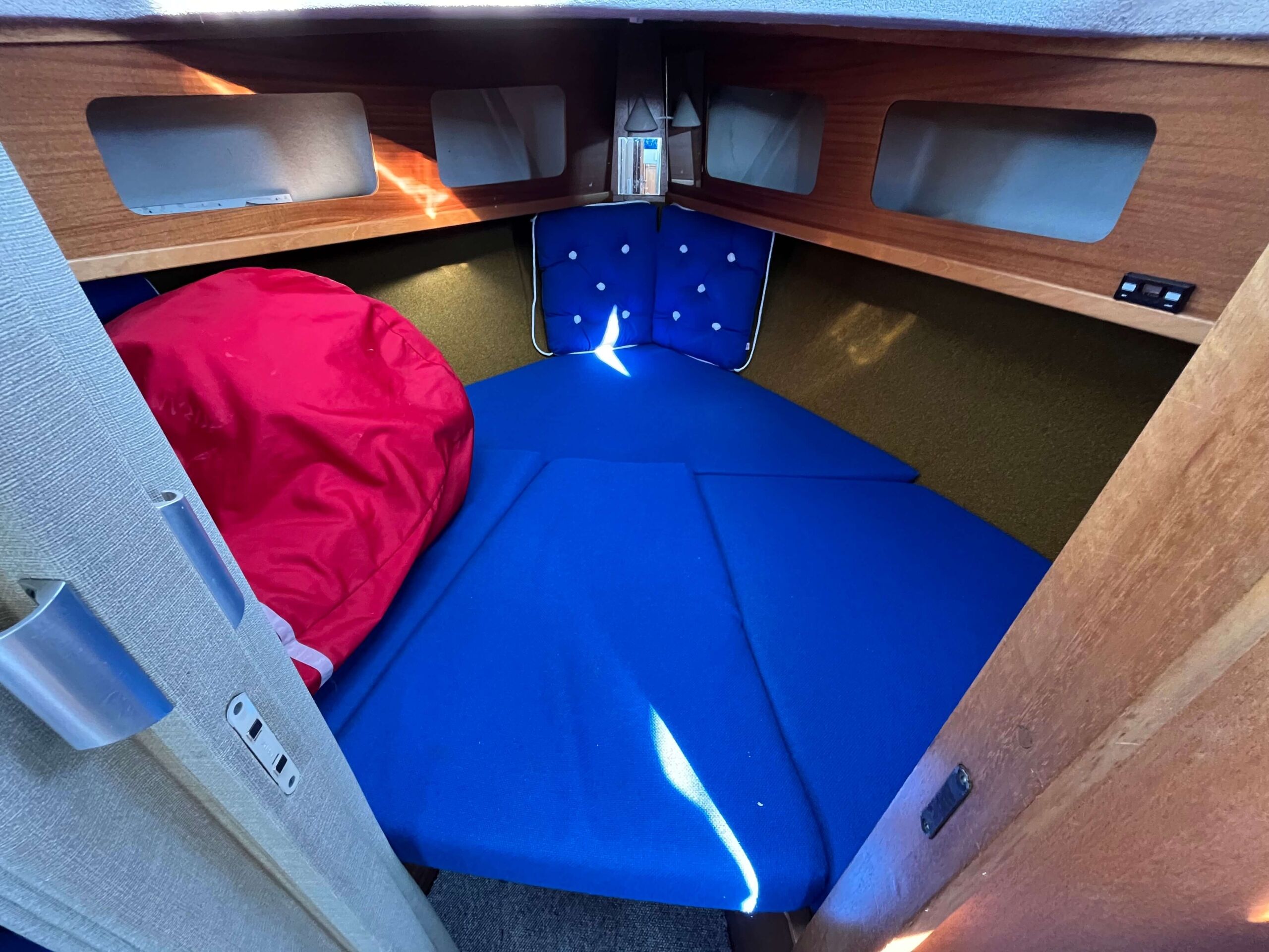 Traditionel indretning med forkahyt med 2 sovepladser, salon med separat toiletrum, højskab, siddepladser overfor hinanden, som kan omdannes til 2 x 2 sovepladser. Cockpit har styreplads med et godt udsyn, overfor køkken med vask og 2 kogeblus. Agter siddepladser overfor hinanden og bord, som kan foldes ud så man nemt kan sidde 6 personer og spise. En mindre båd, men meget stor rummelighed.