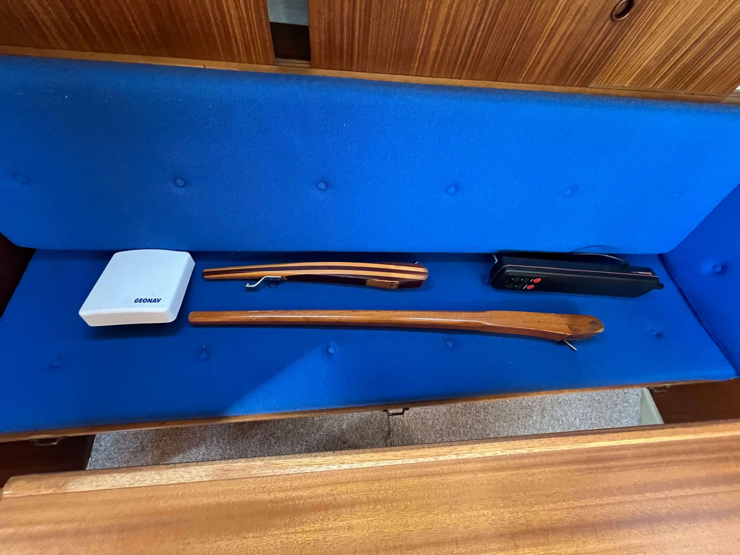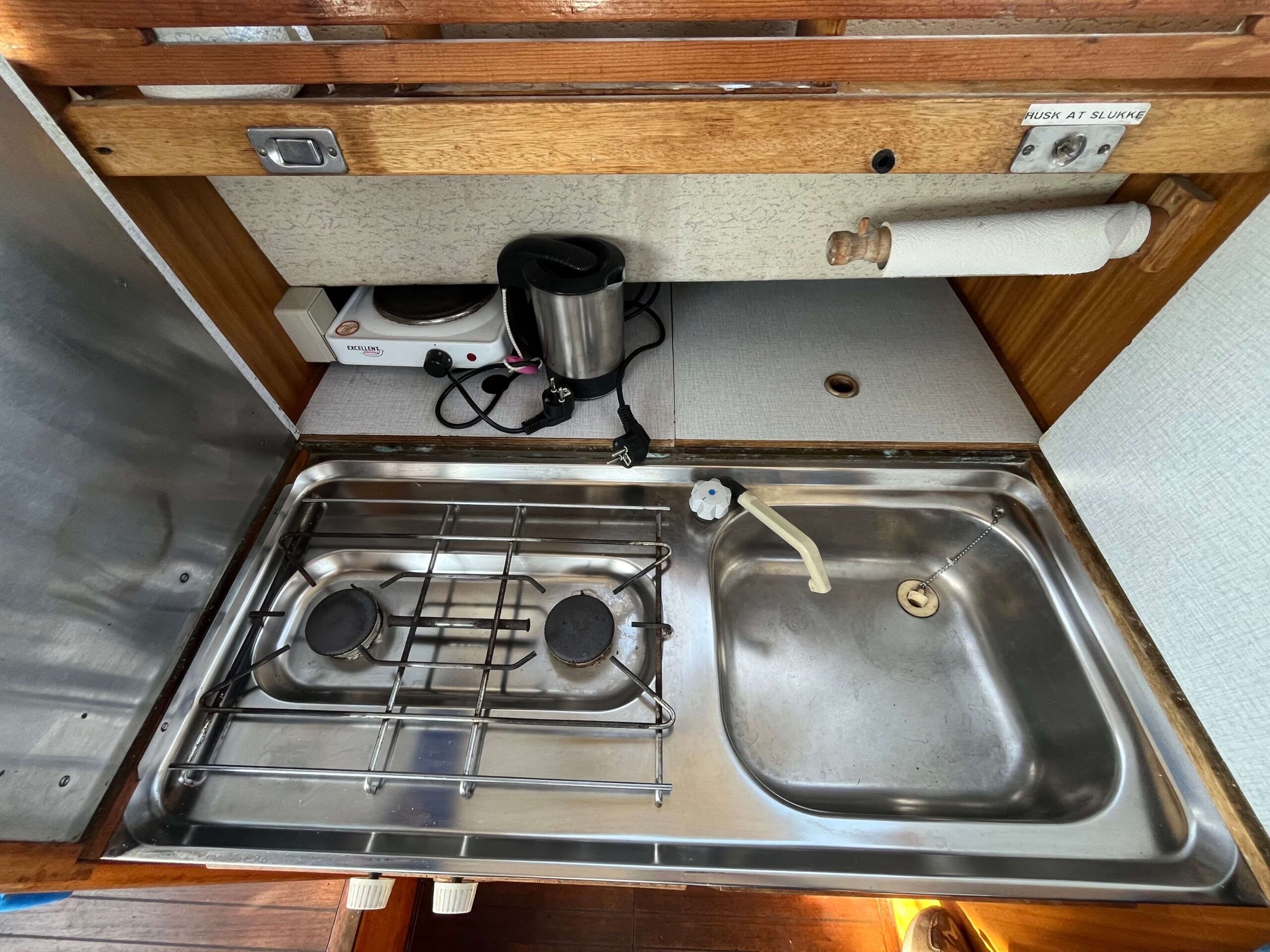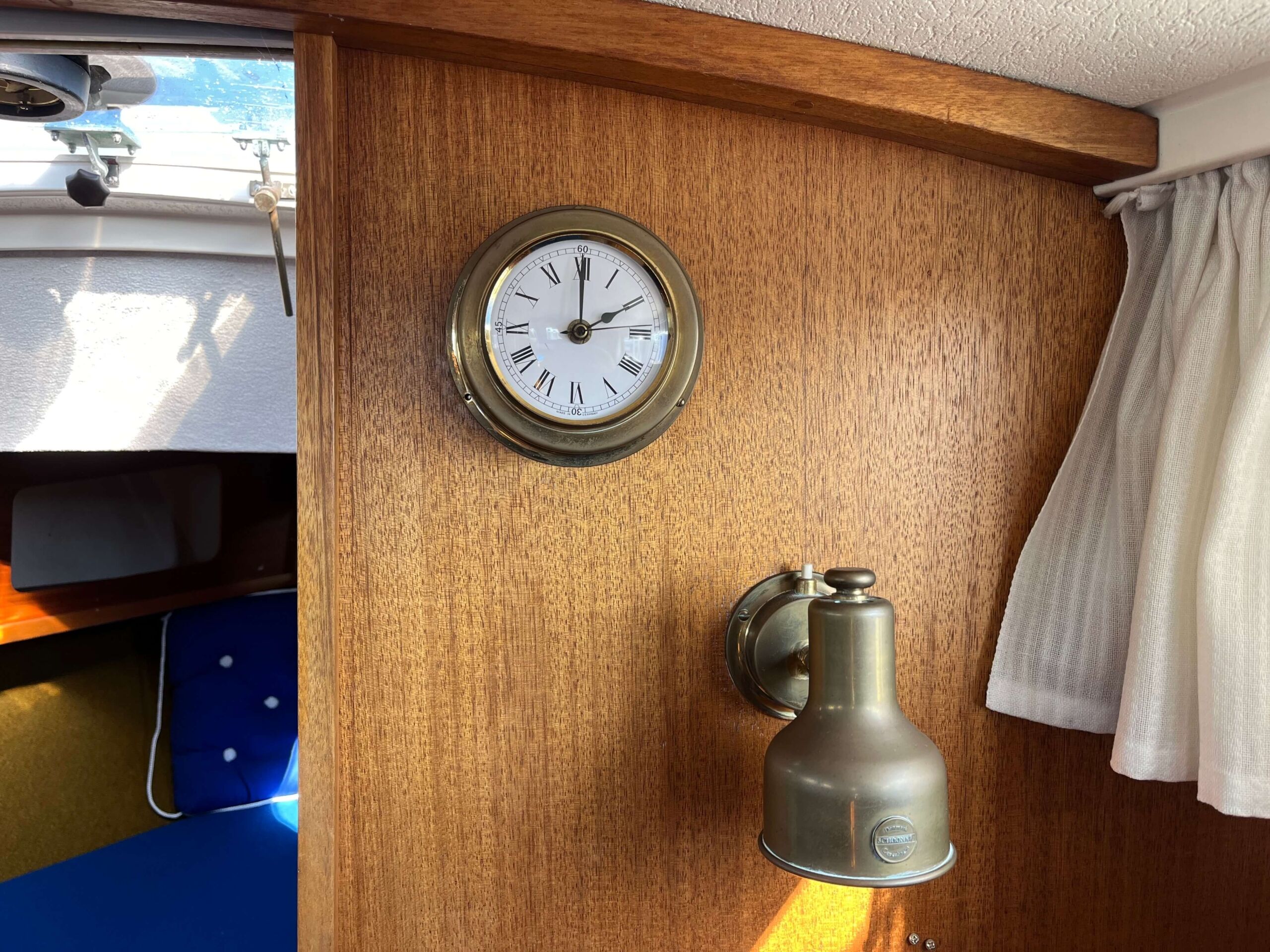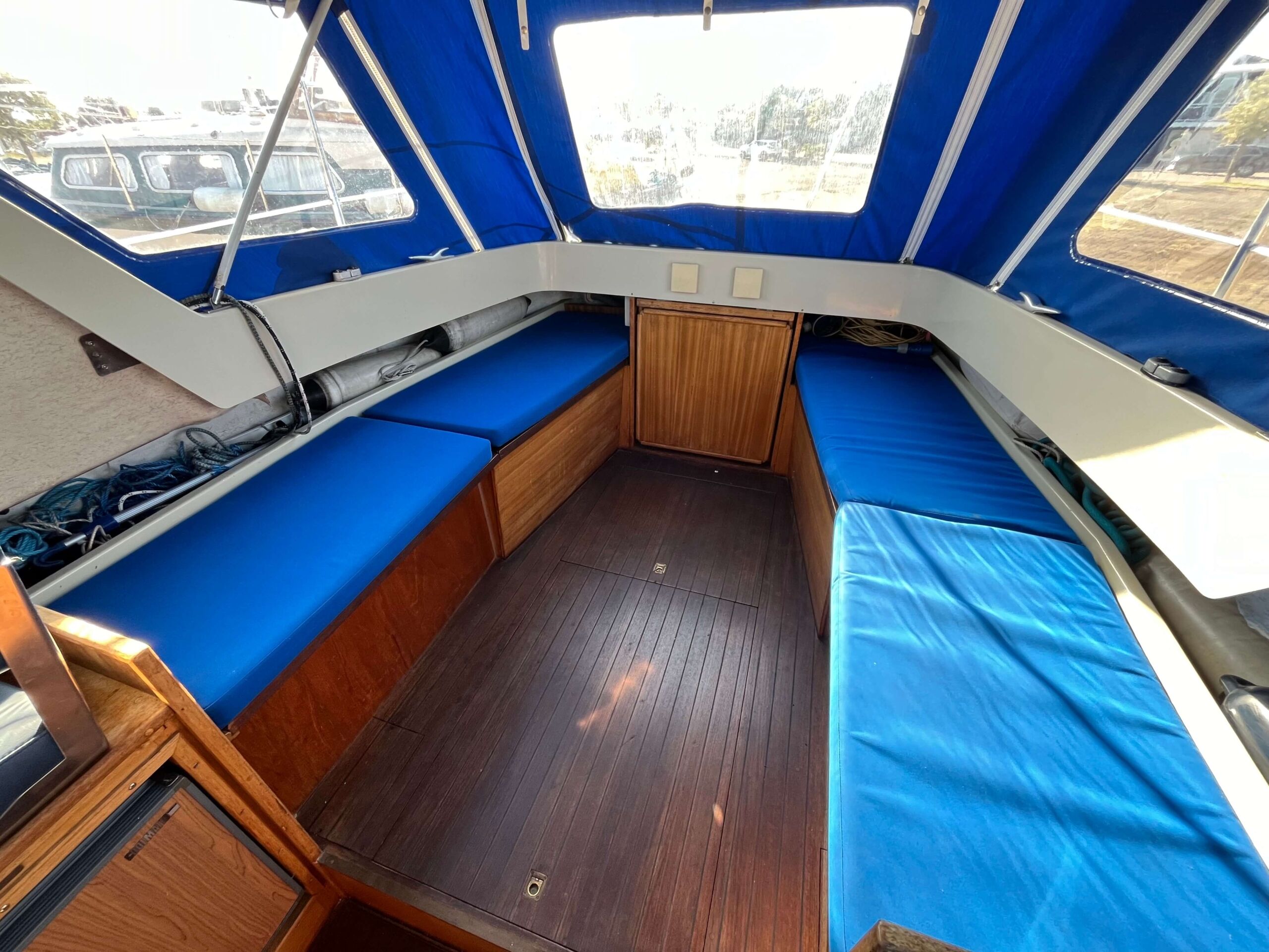 Traditionel indretning med forkahyt med 2 sovepladser, salon med separat toiletrum, højskab, siddepladser overfor hinanden, som kan omdannes til 2 x 2 sovepladser. Cockpit har styreplads med et godt udsyn, overfor køkken med vask og 2 kogeblus. Agter siddepladser overfor hinanden og bord, som kan foldes ud så man nemt kan sidde 6 personer og spise. En mindre båd, men meget stor rummelighed.